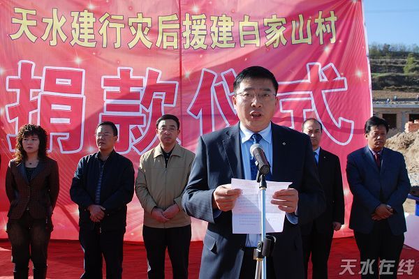 10月24日下午,秦州區(qū)在皂郊鎮(zhèn)白家山村舉行天水市建設銀行災后援建白家山村捐款儀式,儀式上天水市建行捐款35萬用于白家山村災后重建,天水市委常委、秦州區(qū)委書記張健出席儀式。