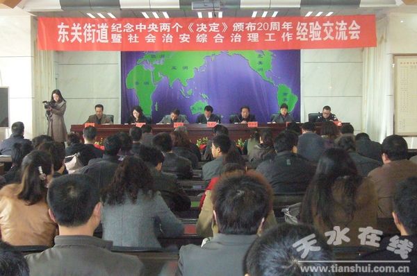 (秦州區(qū)外宣辦 辛志鋒)3月30日下午,東關街道辦事處召開紀念中央兩個《決定》頒布二十周年暨社會治安綜合治理工作經驗交流會。會議的主要內容是為了隆重紀念《中共中央、國務院關于加強社會治安綜合治理的決定》和《全國人大常委會關于加強社會治安綜合治理的決定》頒布20周年,認真總結近幾年東關街道社會治安綜合治理工作經驗,推廣一些單位好的經驗和做法,達到相互學習、相互交流、取長補短、共同提高的目的,推動街道社會治安綜合治理和社會矛盾化解、社會管理創(chuàng)新、公正廉潔執(zhí)法三項重點工作走向深入,為建設平安、文明、和諧街道創(chuàng)造良好的治安環(huán)境。