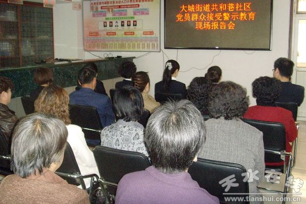 按照秦州區(qū)委及街道黨工委反腐倡廉“警示教育周”活動的安排,4月22日上午,大城街道共和巷社區(qū)黨總支組織全體黨員干部和部分居民群眾百余人認真觀看了警示教育片《小官大腐 》。