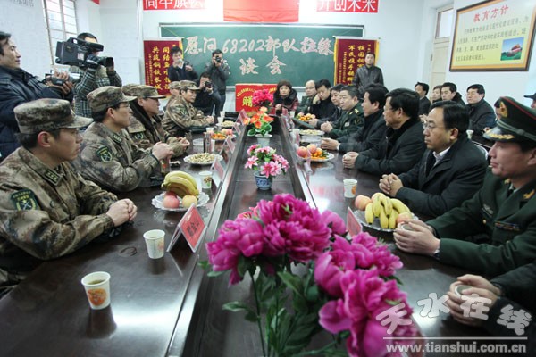 張明泰一行給部隊官兵送去了豬肉、帶魚、水果、蔬菜等價值2.6萬元的慰問品,并在娘娘壩中學和部隊首長進行座談交流,共敘魚水深情。張明泰說,68202部隊是一支有著光榮傳統(tǒng)的鋼鐵之師、英雄部隊,為地方經(jīng)濟發(fā)展、社會事業(yè)的繁榮進步作出了貢獻,特別當發(fā)生地震、山洪暴發(fā)等自然災(zāi)害時部隊官兵總是沖在第一線為黨和政府分憂解愁,為受災(zāi)百姓筑起安全屏障。他表示,秦州人民和各級黨委、政府將一如既往地做好擁軍工作,盡可能為部隊提供最好的服務(wù)和支持。
