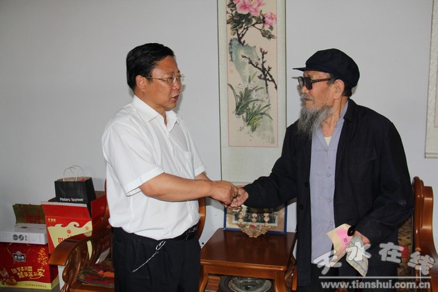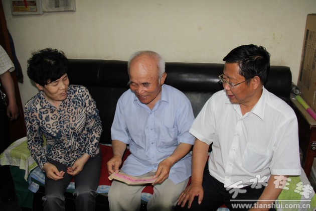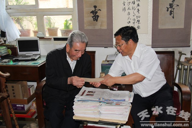 今年75歲高齡的老黨員王耀,1956年加入中國共產(chǎn)黨。在企業(yè)退休后,他積極從事天水民俗研究,出版了多部介紹天水民俗方面的書籍。文月平握著王老的手說:你是一名有著56年黨齡的老黨員,退休后還筆耕不輟,為宣傳天水做出了自己的努力,取得了顯著成績,在建黨91周年來臨之際,我們來看望您,祝愿你的新書早日出版,祝您身體健康!”老黨員王耀對文月平一行的到來感到十分高興,他說:“感謝黨委政府對我們的關(guān)心,我熱愛天水民俗研究,只要我身體允許,我會繼續(xù)研究天水民俗文化,為宣傳天水做出自己的努力!