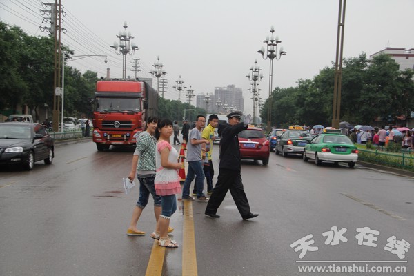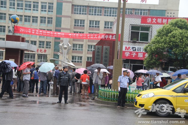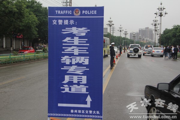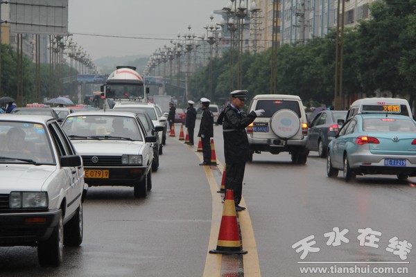 6月8日,2013年高考進(jìn)入關(guān)鍵時(shí)刻,天水市秦州郊區(qū)交警把高考交通安全保障工作列為首要任務(wù)來抓,冒雨按時(shí)到達(dá)四中考點(diǎn)路段,保障高考的進(jìn)行。