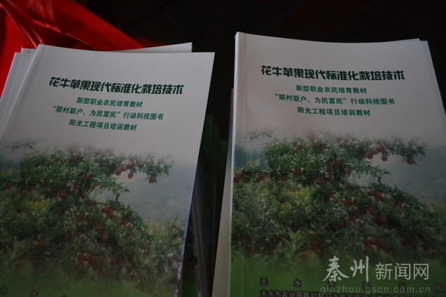 培訓(xùn)課結(jié)束后,秦州區(qū)農(nóng)廣校的工作人員還給每位村民發(fā)放了《花牛蘋果現(xiàn)代標(biāo)準(zhǔn)化栽培技術(shù)》和修建果樹的專用剪刀。