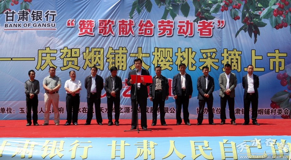 5月18日上午,由天水在線策劃、實施,秦州區(qū)玉泉鎮(zhèn)人民政府、天水在線 、天水市綠之源農業(yè)發(fā)展有限公司主辦,甘肅銀行、秦州區(qū)煙鋪村委會協(xié)辦的甘肅銀行“贊歌獻給勞動者”——慶賀煙鋪大櫻桃開摘上市文藝演出在秦州區(qū)煙鋪大櫻桃市場隆重舉行。