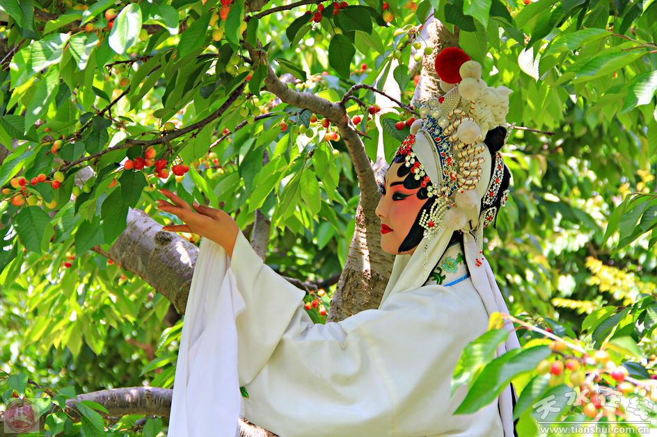 (天水市秦劇團的演員在煙鋪大櫻桃采摘園游園賞果)