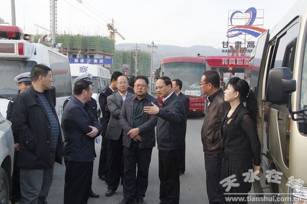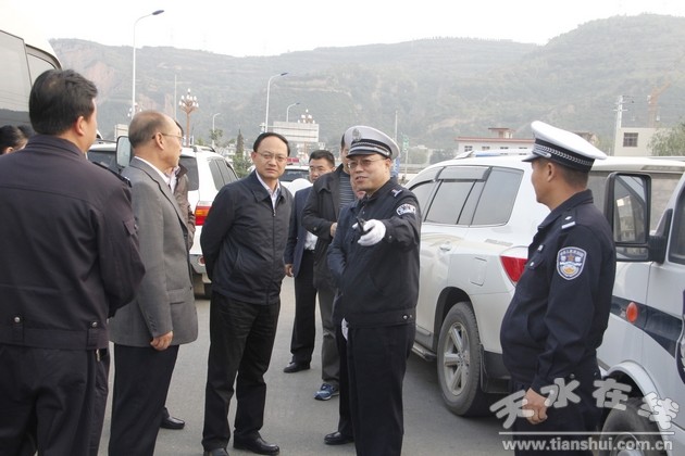 10月8日下午,天水市副市長王鈞帶領(lǐng)交警、建設(shè)、質(zhì)監(jiān)等部門負(fù)責(zé)人,在秦州區(qū)副區(qū)長顧應(yīng)存及相關(guān)部門人員的陪同下,來到秦州郊區(qū)交警大隊西十里高速公路口卡口執(zhí)勤點,就規(guī)范執(zhí)勤執(zhí)法、嚴(yán)查“兩客一!奔鞍偃展詫m椥袆忧闆r進(jìn)行檢查。