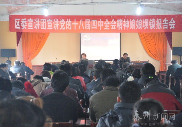 。ㄇ刂輩^(qū)外宣辦)為了進一步學習宣傳貫徹黨的十八屆四中全會精神,在全區(qū)各鄉(xiāng)鎮(zhèn)、街道、部門迅速掀起學習宣傳四中全會精神的熱潮,根據(jù)區(qū)委統(tǒng)一安排部署,11月28日,秦州區(qū)委宣講團深入娘娘壩鎮(zhèn)舉行首場宣講報告會,就十八屆四中全會精神作全面深刻的解讀。娘娘壩鎮(zhèn)全體干部職工和村干部聆聽了宣講報告。
