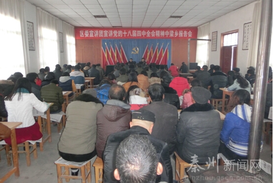 在全區(qū)上下深入學(xué)習(xí)宣傳黨的十八屆四中全會(huì)精神之際,12月17日,秦州區(qū)宣講團(tuán)赴中梁鄉(xiāng)就十八屆四中全會(huì)精神進(jìn)行了宣講。鄉(xiāng)村兩級(jí)干部、鄉(xiāng)屬單位負(fù)責(zé)人共計(jì)130余人聆聽(tīng)了報(bào)告。