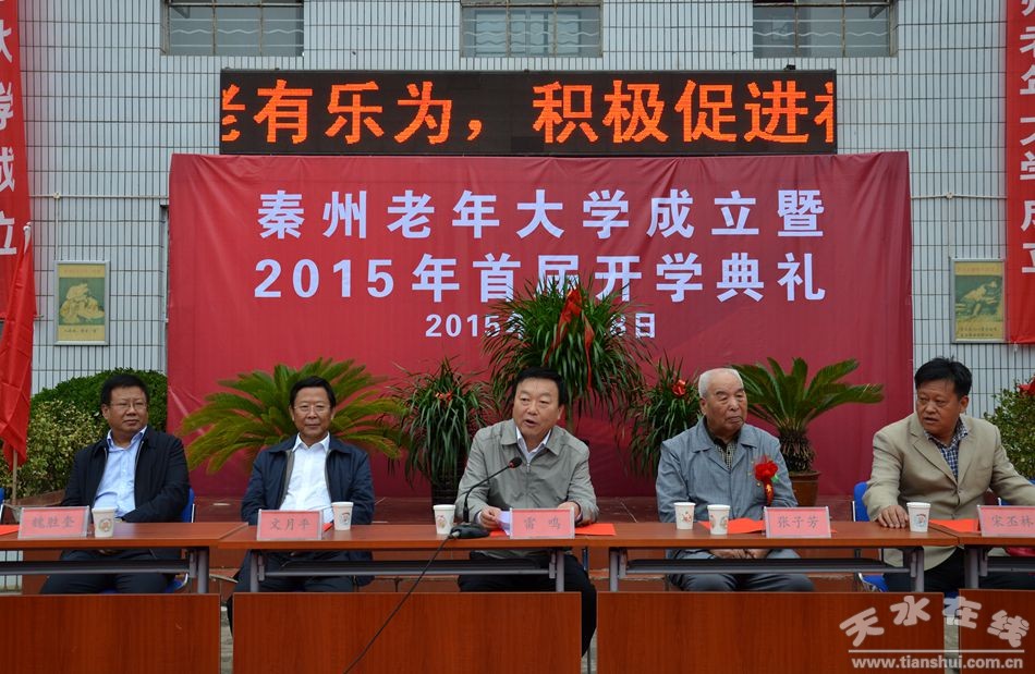 9月28日上午,秦州老年大學(xué)成立暨2015年首屆開學(xué)典禮隆重舉行,市委常委、秦州區(qū)委書記雷鳴出席典禮并為老年大學(xué)揭牌。