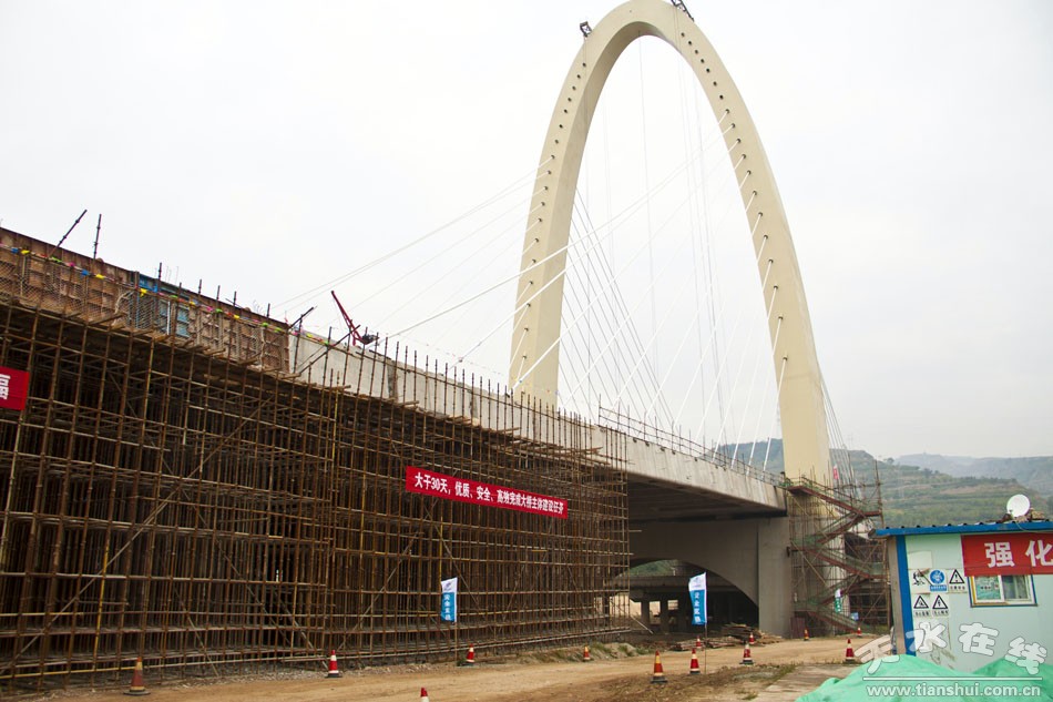 秦州區(qū)山水一號(hào)大橋位于秦州區(qū)“山水新城”保障性住房西側(cè)平峪溝以北300米處,項(xiàng)目預(yù)算總投資1.64億元,該橋橫跨藉河、天定高速,南起316國(guó)道,北與藉河河堤規(guī)劃路銜接。大橋全長(zhǎng)1254.52米,其中橋長(zhǎng)565米,橋梁設(shè)計(jì)寬度25.6米。大橋分南引橋、主橋和北引橋三部分,其中南引橋?yàn)椋?×30)m預(yù)應(yīng)力混凝土現(xiàn)澆箱梁,主橋?yàn)椋?15+130)m獨(dú)塔雙索面預(yù)應(yīng)力混凝土斜拉橋,北引橋?yàn)椋?×20+2×3×20)m鋼筋混凝土現(xiàn)澆箱梁,大橋兩側(cè)連接線長(zhǎng)689.52米。設(shè)計(jì)荷載為公路1級(jí),行車(chē)速度每小時(shí)40公里。該橋建設(shè)融城市景觀和交通為一體,是聯(lián)接藉河南、北兩個(gè)片區(qū)的外環(huán)快速通道樞紐工程,也是我市對(duì)外展示形象的窗口工程。