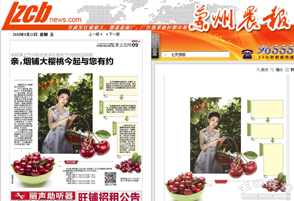 “電商+融媒體”!皺烟艺娴牟诲e(cuò)!甜中略帶酸,好櫻桃就應(yīng)該這味道。”“謝謝你們,櫻桃又大又甜,確實(shí)是一分價(jià)錢一分貨!”……據(jù)悉,今年,《蘭州晨報(bào)》客戶端“掌上蘭州”與天水在線網(wǎng)店強(qiáng)強(qiáng)聯(lián)合,《蘭州晨報(bào)》采用平面紙媒、官方大隴網(wǎng)、客戶端“掌上蘭州”融媒體三位一體的方式,前后10多次全方位推介秦州大櫻桃,并面向蘭州地區(qū)用戶展開了手機(jī)在線預(yù)訂,顧客半徑輻射至北京、重慶、杭州、海南等地。