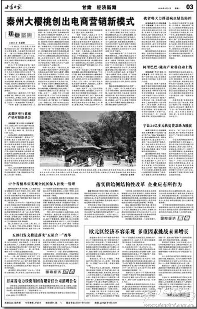 精準(zhǔn)扶貧精準(zhǔn)脫貧是天水市的“一號(hào)工程”!半娚+”的“天水模式”成為天水市幫農(nóng)增收、助農(nóng)脫貧的重要舉措,也是打造當(dāng)?shù)剞r(nóng)產(chǎn)品品牌,促進(jìn)果業(yè)轉(zhuǎn)型升級(jí),提升當(dāng)?shù)刂群陀绊懥Φ囊淮斡幸嫣剿。通過整合社會(huì)各類資源,搭建線上線下平臺(tái),暢通了銷售渠道,為“秦州大櫻桃”暢銷全國(guó)鋪設(shè)出一架縱橫交錯(cuò)的“互聯(lián)網(wǎng)天橋”。