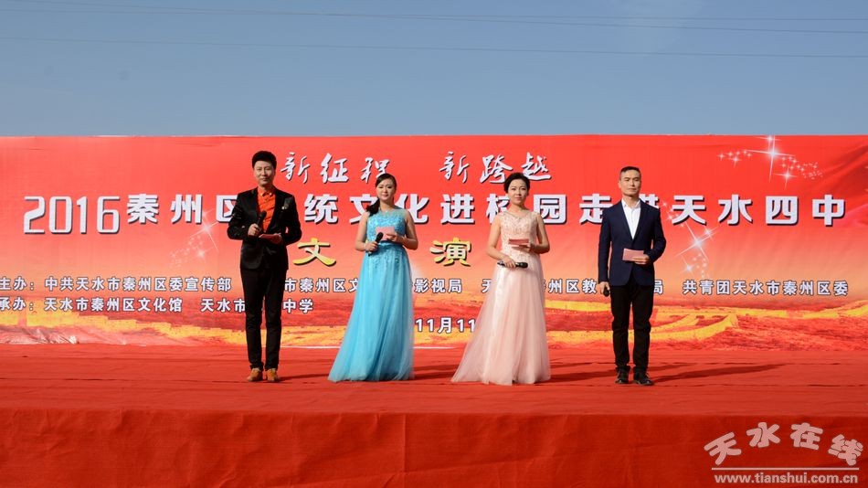 為了大力弘揚(yáng)優(yōu)秀傳統(tǒng)文化,踐行社會主義核心價值觀,深入貫徹落實十八屆六中全會精神、市區(qū)“黨代會”及人大政協(xié)“兩會”精神,2016年11月11日,由秦州區(qū)委宣傳部、區(qū)文廣局、區(qū)教體局、團(tuán)區(qū)委主辦,區(qū)文化館、天水四中承辦的 “新征程-新跨越”2016秦州區(qū)傳統(tǒng)文化進(jìn)校園活動在充滿活力的天水四中隆重舉行,區(qū)委常常委、宣傳部長曹亞玲做了重要講話。區(qū)人大副主任崔麗霞,區(qū)政協(xié)副主席郭金霞、羅榮昌、李紅軍參加了活動。區(qū)文廣局局長秦毅敏主持活動并為天水市四中頒發(fā)了傳統(tǒng)文化普及教育示范基地銅牌,區(qū)教體局黨委副書記柏甲戌、區(qū)文化館館長趙暉先后致辭和介紹有關(guān)情況。