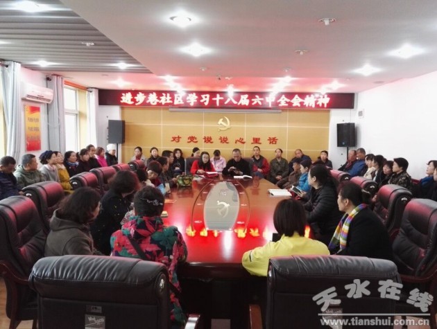 11月11日,進(jìn)步巷社區(qū)黨總支組織社區(qū)全體黨員干部認(rèn)真學(xué)習(xí)貫徹黨的十八屆六中全會精神,學(xué)習(xí)中緊緊圍繞習(xí)近平總書記在黨的十八屆六中全會上的重要講話和全會審議通過的《關(guān)于新形勢下黨內(nèi)政治生活的若干準(zhǔn)則》、《中國共產(chǎn)黨黨內(nèi)監(jiān)督條例》,使大家充分認(rèn)識到黨的十八屆六中全會的重大意義和規(guī)范黨內(nèi)政治生活的重要性。
