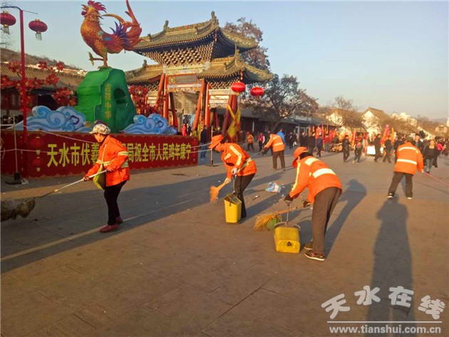 為了做好廟會期間伏羲廟步行街及周邊的市容環(huán)境保障工作,秦州區(qū)城鄉(xiāng)環(huán)衛(wèi)局成立領(lǐng)導(dǎo)小組,科學(xué)部署值勤力量,采取定人、定崗值守等方式,加強伏羲城步行街各主要路口和重要位置的市容環(huán)境衛(wèi)生管理和清掃保潔力度,切實為市民群眾營造良好、文明、有序的節(jié)日環(huán)境。