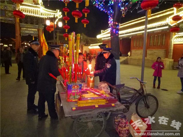 抽調(diào)環(huán)衛(wèi)執(zhí)法和環(huán)衛(wèi)管理人員120余人,建立了“四班倒”24小時晝夜不間斷巡查和值守制度。在伏羲城各個出入口安排專人執(zhí)勤,禁止機動車駛?cè)耄沤^流動攤販進入;在伏羲城步行街劃定專門的自行車、摩托車停放區(qū)域;全面督促規(guī)范伏羲城步行街內(nèi)商戶經(jīng)營行為對物品亂堆亂放、占道經(jīng)商,亂擺攤點行為;對伏羲城步行街內(nèi)流動攤點實行準入制度,除在伏羲城內(nèi)劃定專門的香蠟攤位外,僅允許有特色,能營造廟會氛圍的攤點在劃定區(qū)域擺放,將其余的餐飲小吃等攤點,配合綜合執(zhí)法部門統(tǒng)一安排在女媧路進行經(jīng)營,有效保障了廟會期間伏羲城步行街的市場秩序。