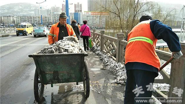 由于降雪量大,降雪在形成積雪的同時,在行人的踩踏和車輛的碾壓下,也形成了大面積的融雪。為及時清理積雪、融雪,確保融雪不過夜、不形成結(jié)冰,秦州區(qū)城鄉(xiāng)環(huán)衛(wèi)局出動環(huán)衛(wèi)工人1200余人,動用大型高壓沖洗車3輛、小型多動能沖洗車6輛、護欄清洗車1輛,利用手推車、鏟雪板、鐵鍬、掃帚等工具對城市主次干道積雪、融雪進行了全面清理,并對污漬殘留的路面進行了沖洗,有效保障了車輛行人安全和城市道路整潔有序。