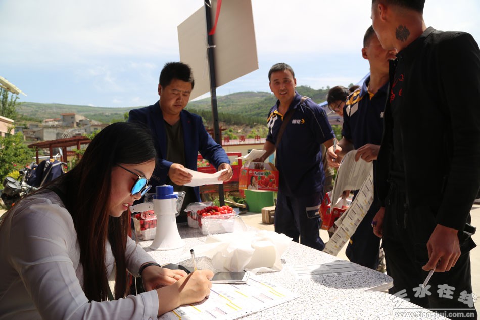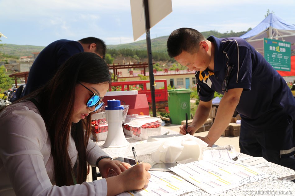 (天水在線工作人員給煙鋪果農(nóng)發(fā)放手持二維碼 天水在線攝于5月26日上午)