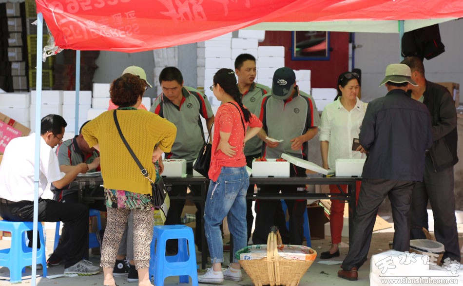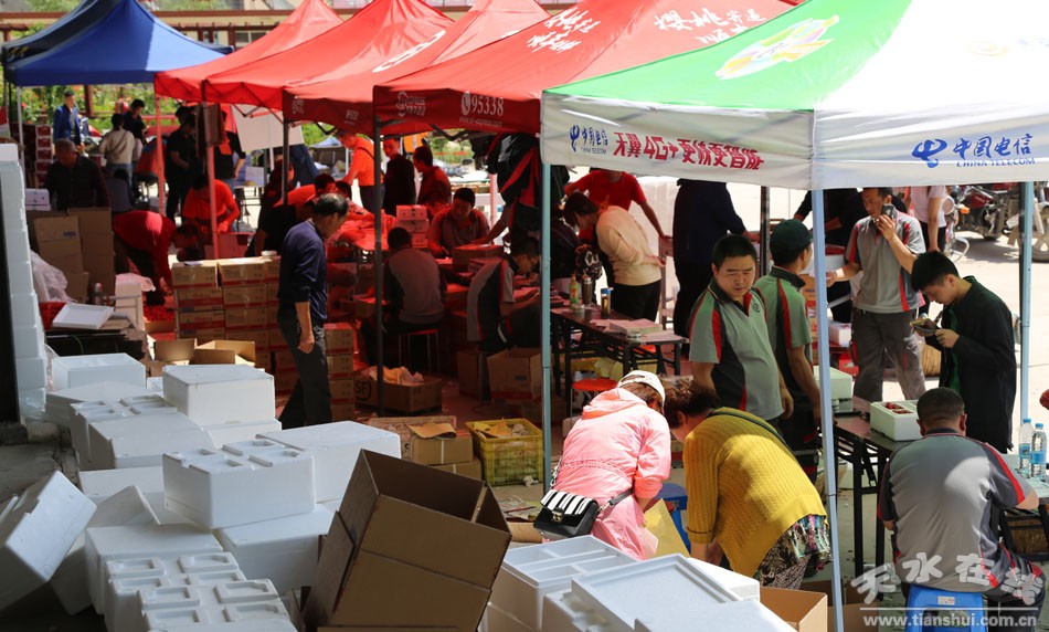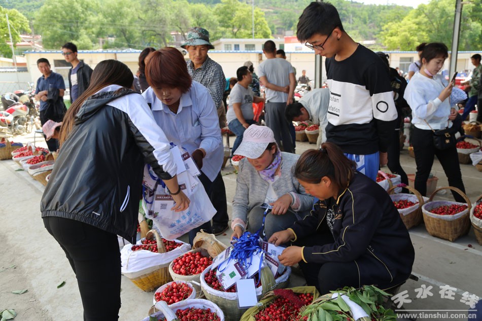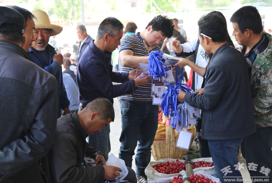 5月26日上午,天水在線記者在煙鋪大櫻桃市場看到,煙鋪大櫻桃已經(jīng)全面上市,市場交易火爆。部分果農(nóng)攜帶手持二維碼,消費(fèi)者可以通過微信進(jìn)行付款(天水在線將于明天舉行的煙鋪櫻桃季鄉(xiāng)村美食節(jié)開幕儀式上為果農(nóng)集中發(fā)放手持二維碼,界時絕大部分果農(nóng)在市場銷售櫻桃時,將能夠通過微信收款。)。特別是順豐、郵政、德邦等幾家快遞收寄點(diǎn),更是被給親朋好友寄送櫻桃的客戶擠的水瀉不通。