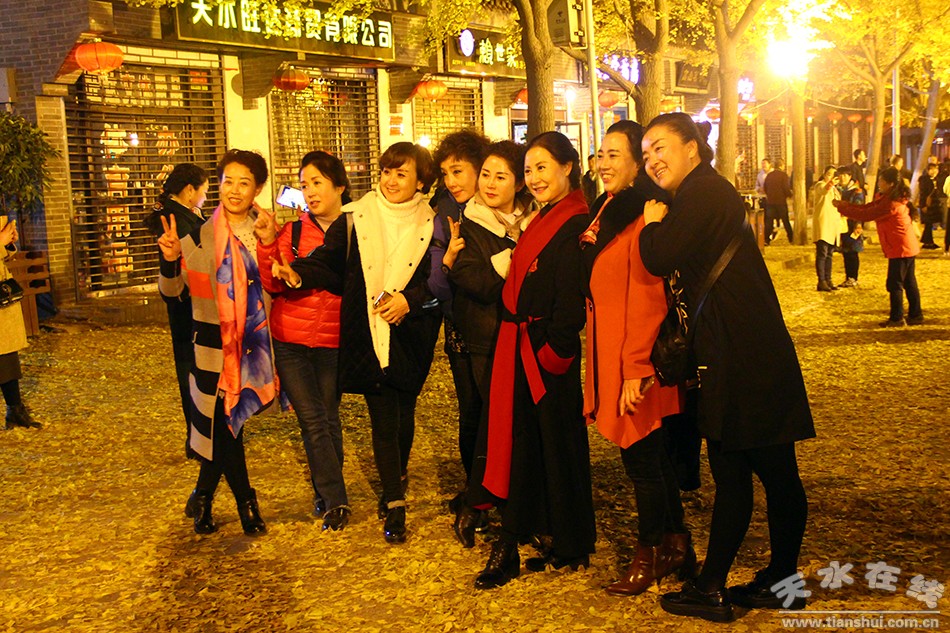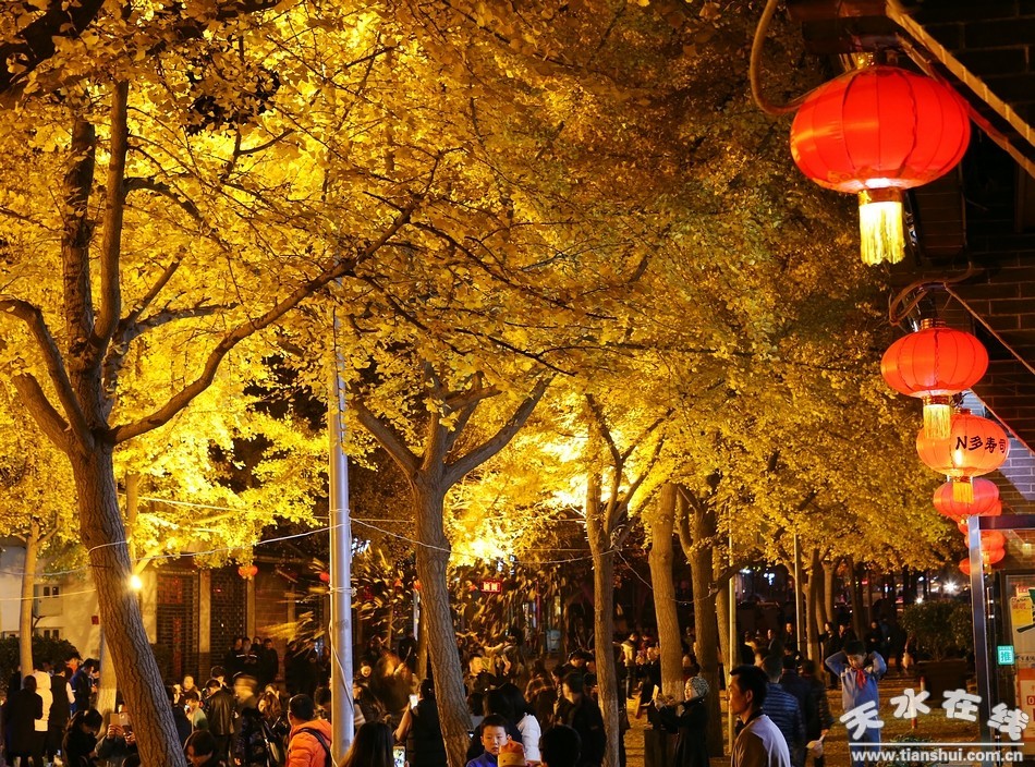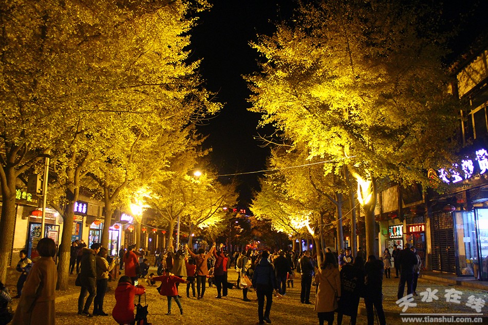 。ㄇ刂輩^(qū)外宣辦 楊晨)11月9日,秦州市民迎來青年北路“黃金大道”臨時改為步行街來的第一夜。今年秦州區(qū)把青年北路設(shè)為銀杏“黃金大道”景觀路,在道路兩旁安裝照明射燈,點亮夜晚的黃金大道。市民紛紛拿出相機,在大道上紀錄這古城靚麗夜景。