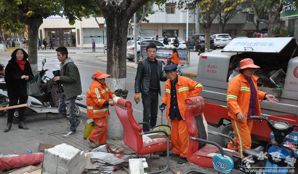 日前秦州區(qū)大城街道辦事處光明巷社區(qū)對轄區(qū)一個(gè)老舊小區(qū)環(huán)境衛(wèi)生組織動(dòng)員居民進(jìn)行了徹底的清掃,清掃現(xiàn)場記者看到,許多被遺棄的桌椅板凳、盆盆罐罐等垃圾堆滿了人行道,環(huán)衛(wèi)工人和居民正在往兩輛環(huán)衛(wèi)運(yùn)輸車上清運(yùn)。經(jīng)過一上午的勞作,這個(gè)老舊小區(qū)的環(huán)境衛(wèi)生面貌煥然一新。
