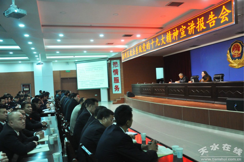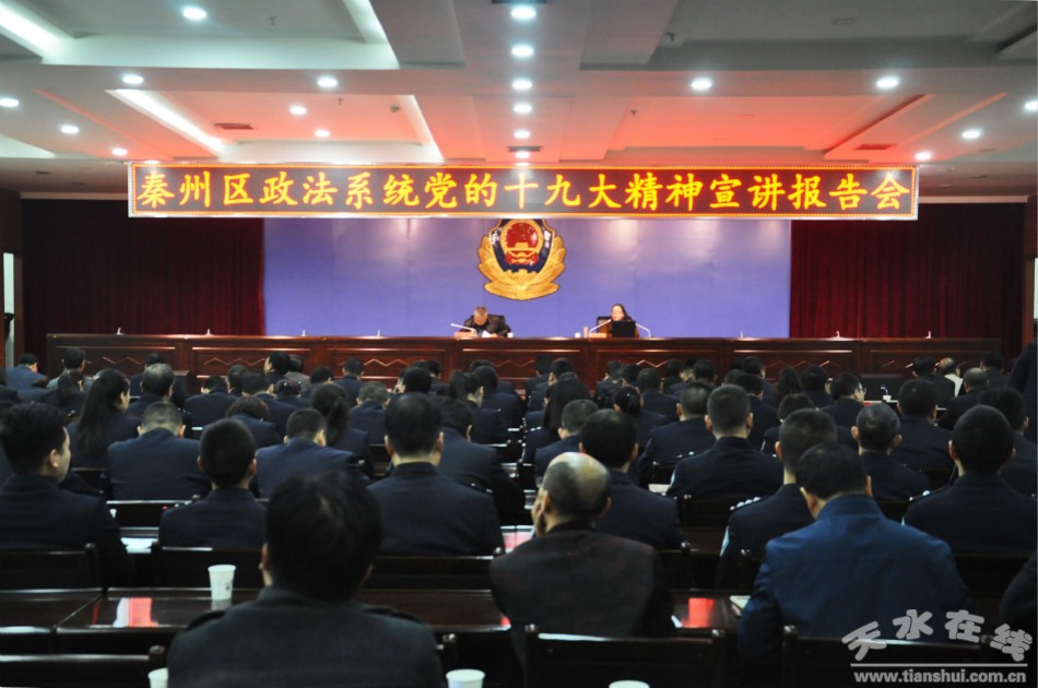 。ㄇ刂輩^(qū)政法委)11月15日下午,秦州區(qū)舉辦政法系統(tǒng)黨的十九大精神宣講報(bào)告會(huì)。市委講師團(tuán)成員、市委黨校副教授郭文娣應(yīng)邀作宣講報(bào)告,區(qū)委常委、政法委書(shū)記劉小平主持報(bào)告會(huì)并講話。