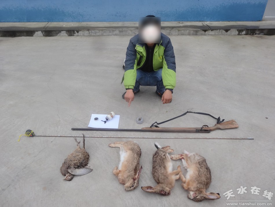 11月5日晚20時(shí)許,秦州公安分局齊壽派出所民警在轄區(qū)巡邏時(shí)發(fā)現(xiàn)稍平公路南側(cè)山坡上有強(qiáng)光手電的亮光,并伴有槍聲,該所民警立即出警,于當(dāng)晚23時(shí)許將犯罪嫌疑人李某抓獲,現(xiàn)場(chǎng)查獲土制獵槍一支、火藥及鐵砂若干,并查獲已獵殺的兔子等獵物若干。目前李某已被秦州公安分局采取刑事強(qiáng)制措施,案件正在進(jìn)一步偵辦中。