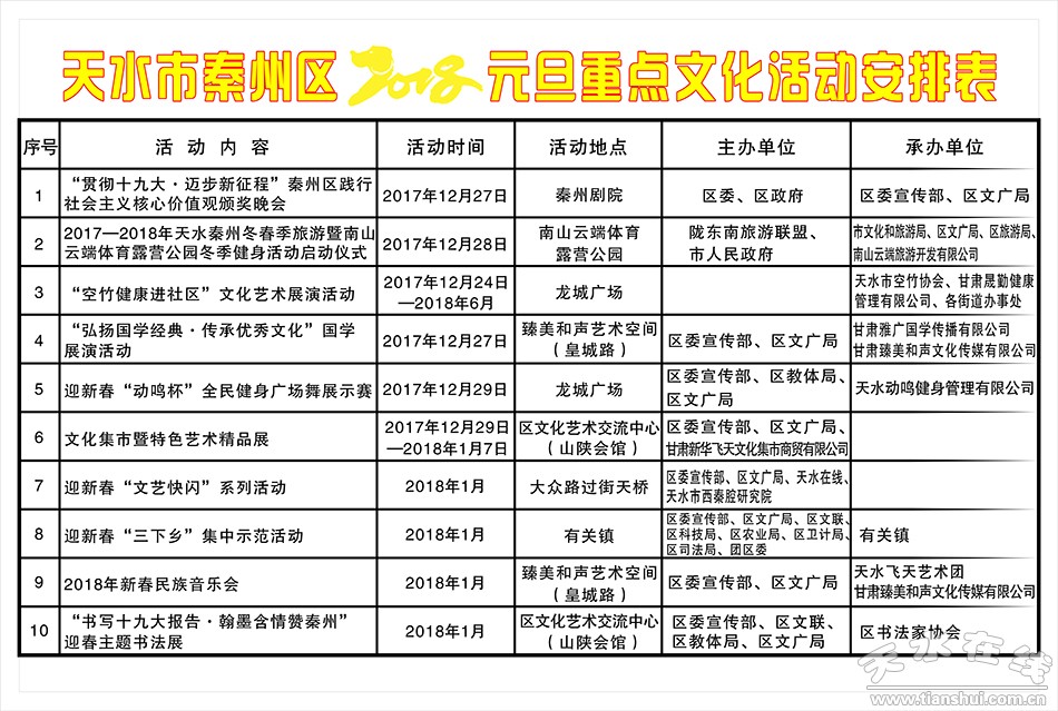 (秦州區(qū)外宣辦 劉可)記者從1月8日召開的秦州區(qū)2018年新春文化活動(dòng)安排會(huì)上獲悉,今年新春期間,秦州區(qū)共組織開展各類文化活動(dòng)40項(xiàng)。除“貫徹十九大·邁步新征程”秦州區(qū)踐行社會(huì)主義核心價(jià)值觀頒獎(jiǎng)晚會(huì)等6項(xiàng)已開展的活動(dòng)外,其余36項(xiàng)活動(dòng)將在1至3月間密集開展。這些活動(dòng)中,既有社火匯演、玉泉觀上九廟會(huì)、元宵節(jié)燈展等保留“節(jié)目”,也有迎新春“文藝快閃”、新春年貨花燈節(jié)、青鵑山滑雪品茗、南山云端戶外健身等新“節(jié)目”。