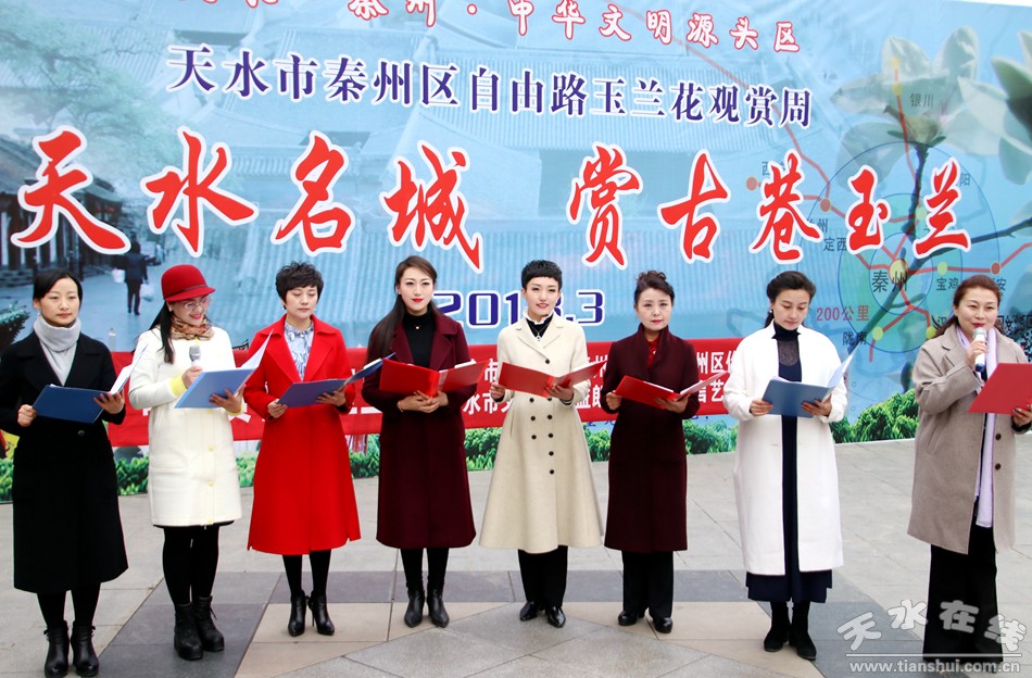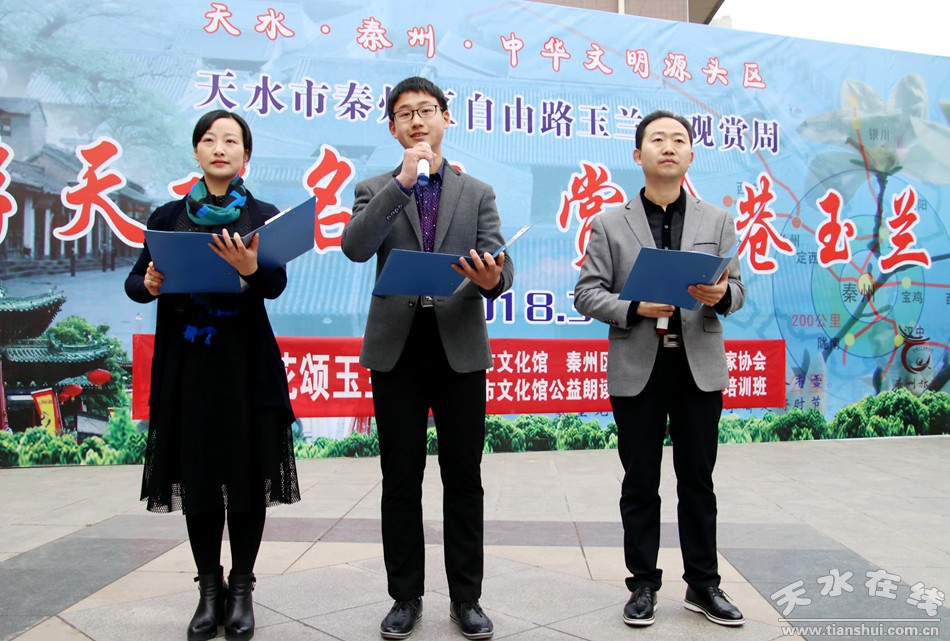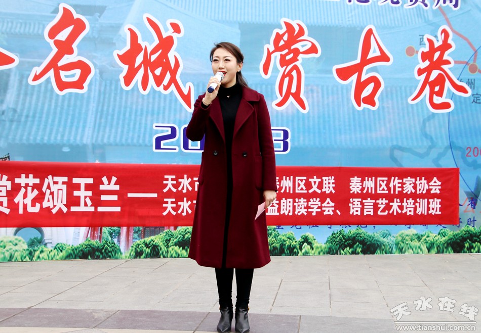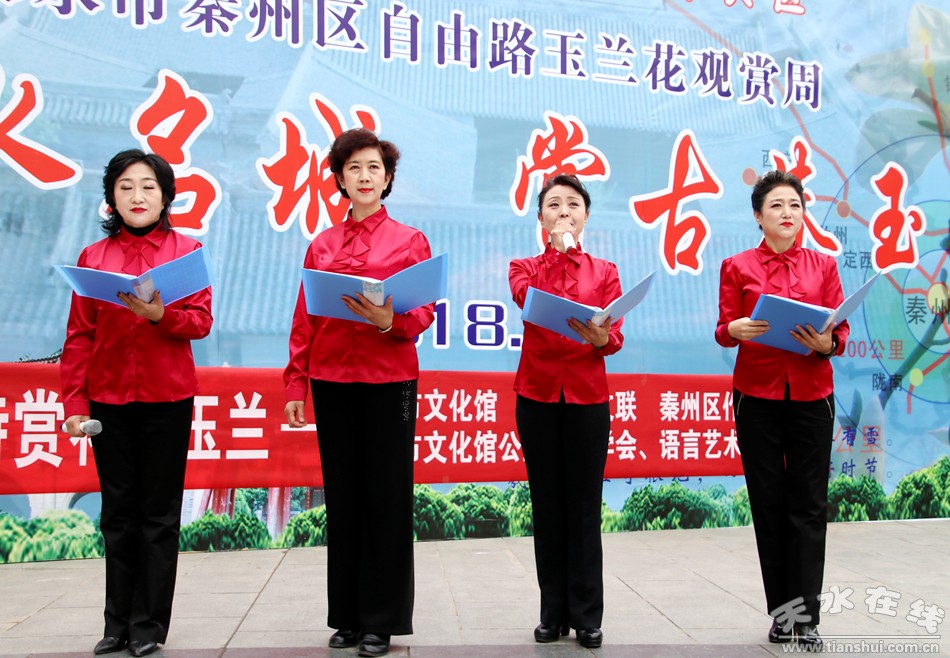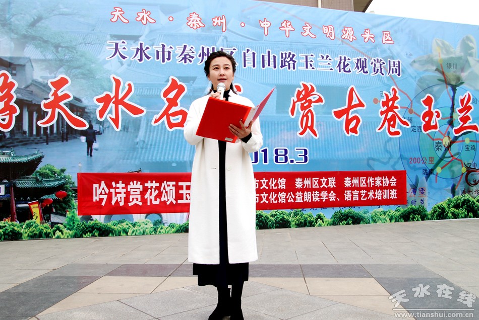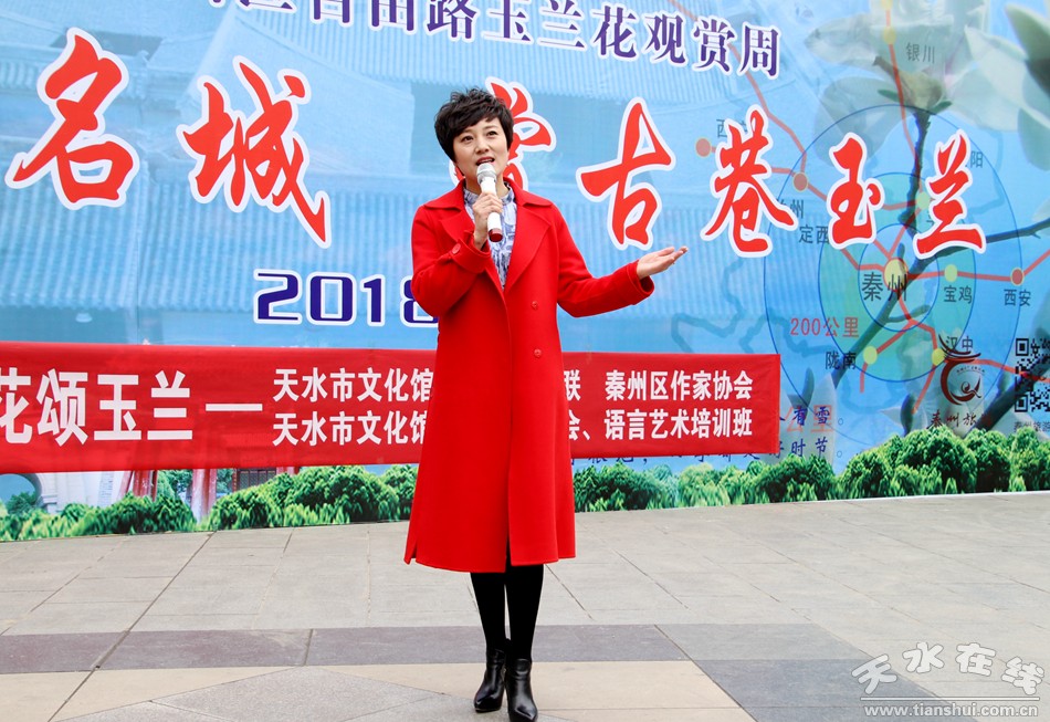 這便是由秦州區(qū)文聯(lián)、區(qū)作協(xié)負(fù)責(zé),邀請市文化館、市朗誦學(xué)會、市文化館語言藝術(shù)免費(fèi)輔導(dǎo)班共同舉辦的“游名城天水,賞古巷玉蘭”活動周之“吟詩賞花頌玉蘭”朗誦會。以上那些優(yōu)美的句子,來自由王文麗、宋惠君、蔡娟、吳靜、杜娟、曹曉燕、孫寧、王淑芬等人共同朗誦的《秦州古巷,玉蘭花開》。