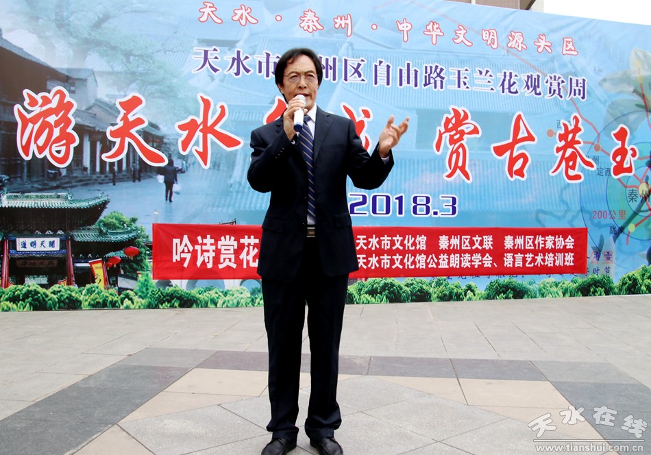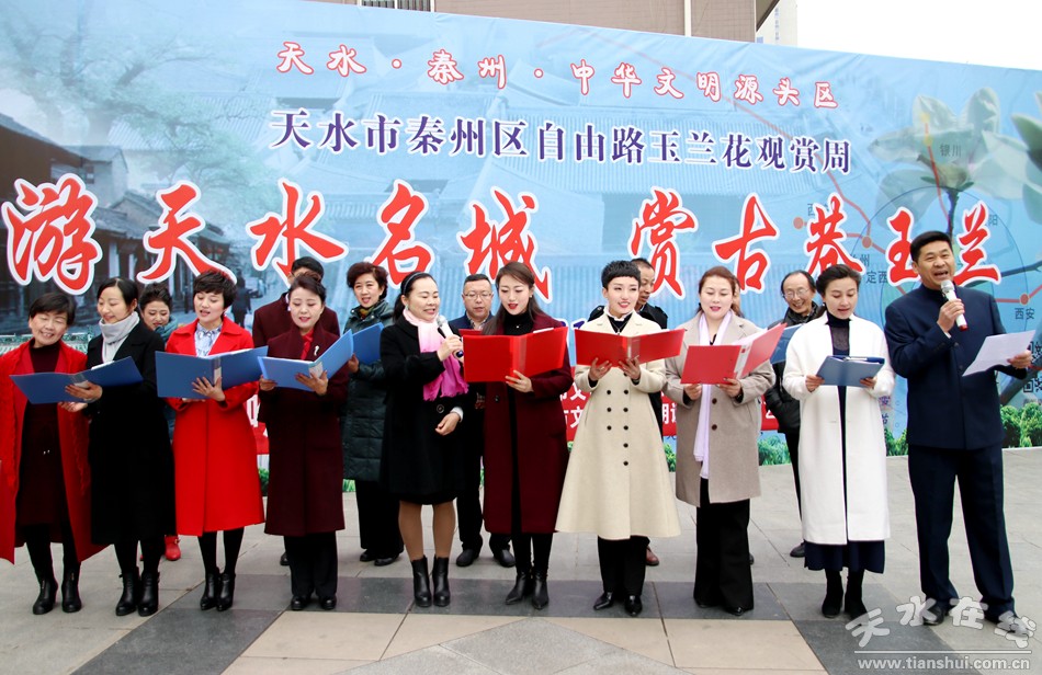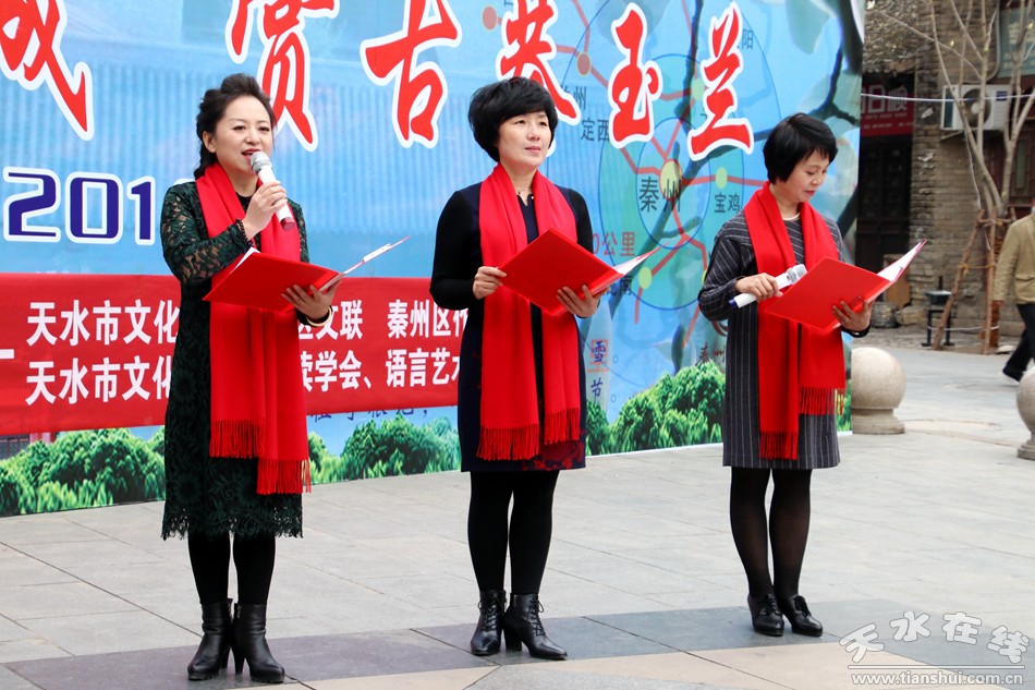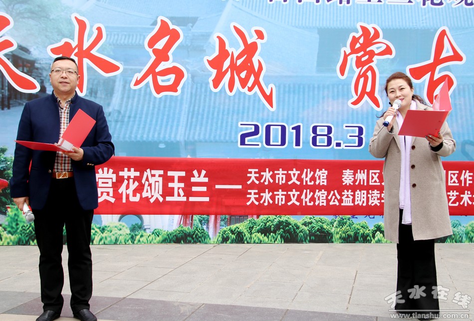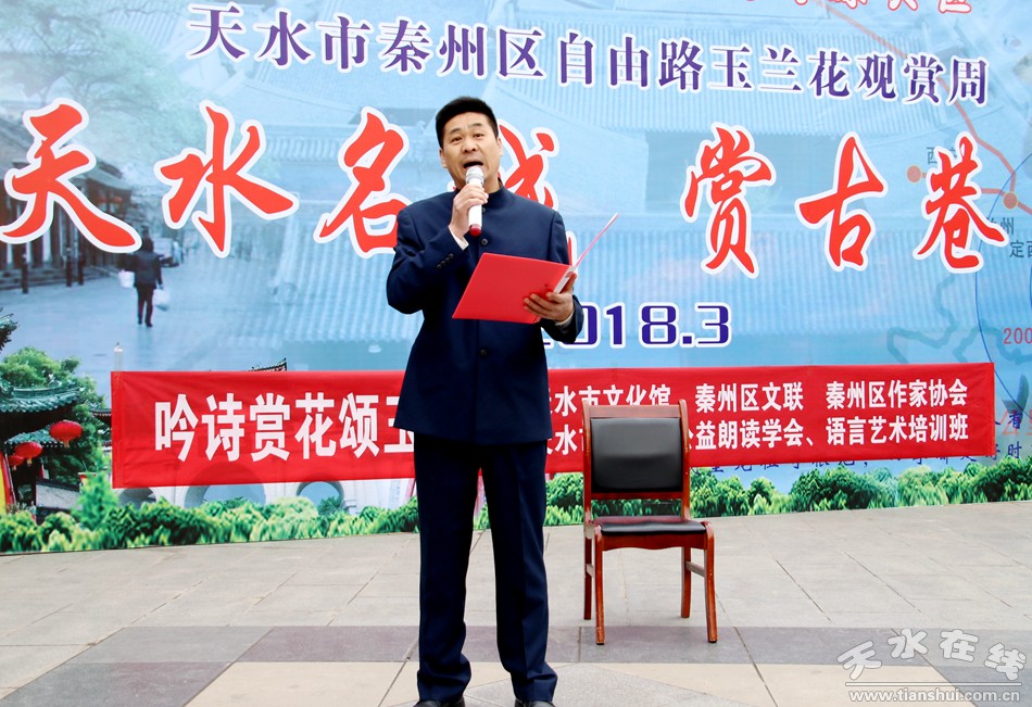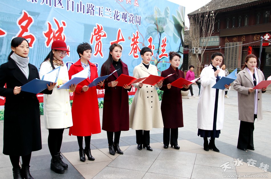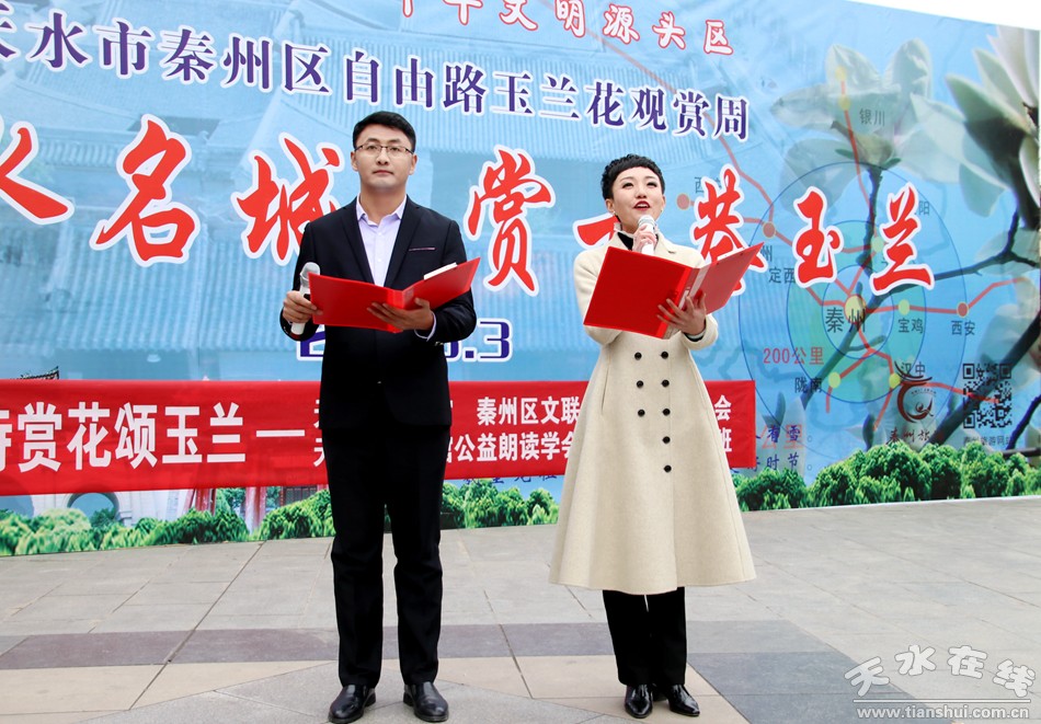 這便是由秦州區(qū)文聯(lián)、區(qū)作協(xié)負(fù)責(zé),邀請市文化館、市朗誦學(xué)會、市文化館語言藝術(shù)免費(fèi)輔導(dǎo)班共同舉辦的“游名城天水,賞古巷玉蘭”活動周之“吟詩賞花頌玉蘭”朗誦會。以上那些優(yōu)美的句子,來自由王文麗、宋惠君、蔡娟、吳靜、杜娟、曹曉燕、孫寧、王淑芬等人共同朗誦的《秦州古巷,玉蘭花開》。