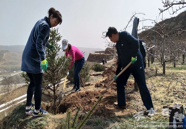 植樹現(xiàn)場,大家兩三人一組,有的手拿鐵鍬,有的手拿洋鎬,以飽滿的熱情、十足的干勁投入到活動中。在挖坑、栽樹、填土、澆水、鋪膜等各個環(huán)節(jié)中,大家緊密配合、相互協(xié)作,盡管大汗淋漓,仍干得熱火朝天。經(jīng)過大家?guī)讉小時的辛勤勞動,146棵新栽的樹苗便迎風(fēng)挺立,為春意盎然的三月增添一抹綠色。