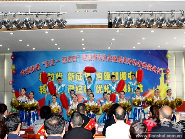 頒獎(jiǎng)典禮文藝表演共分“勞動(dòng)禮贊”和“夢(mèng)想之光”兩個(gè)篇章。文藝表演在中城街道辦事處干部職工表演的開(kāi)場(chǎng)舞《中國(guó)范兒》中拉開(kāi)了序幕。隨后,男聲獨(dú)唱《士兵的桂冠》、小品《回歸》、少兒群舞《天天向上》、朗誦《中國(guó)夢(mèng)、勞動(dòng)美》、少兒舞蹈《咖喱咖喱》、小品《瓜女子相親》、雙人舞《夢(mèng)中的額吉》、武術(shù)表演《太極長(zhǎng)穗劍》、舞蹈《繽紛夏威夷》等一個(gè)個(gè)節(jié)目輪番上演。舞臺(tái)上的演員用傾情忘我的表演向轄區(qū)的廣大勞動(dòng)者致以崇高的敬意和節(jié)日的問(wèn)候,贏得現(xiàn)場(chǎng)觀眾陣陣熱烈的掌聲。