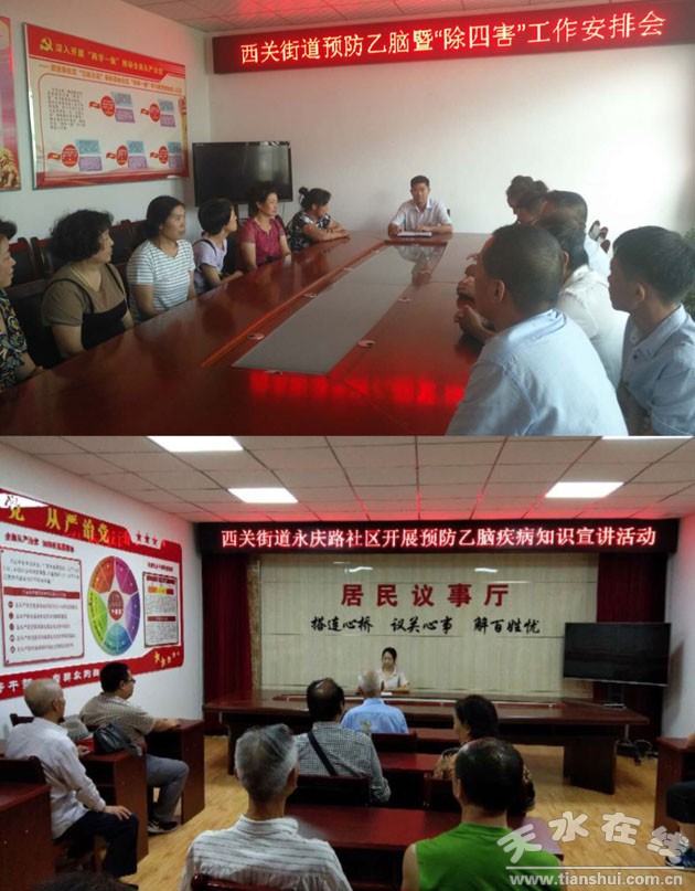 盛夏時(shí)節(jié),蚊、蠅等有害生物繁殖旺盛、活動(dòng)頻繁,為進(jìn)一步做好預(yù)防乙腦暨“除四害”工作,切實(shí)改善轄區(qū)環(huán)境衛(wèi)生,有效降低疾病傳染機(jī)率,為居民營(yíng)造干凈整潔的環(huán)境,8月17日,西關(guān)街道召開預(yù)防乙腦暨“除四害”工作專題會(huì)議。會(huì)上,組織學(xué)習(xí)了預(yù)防乙腦相關(guān)知識(shí),并對(duì)下一步全街道的預(yù)防乙腦暨“除四害”工作進(jìn)行了安排部署。