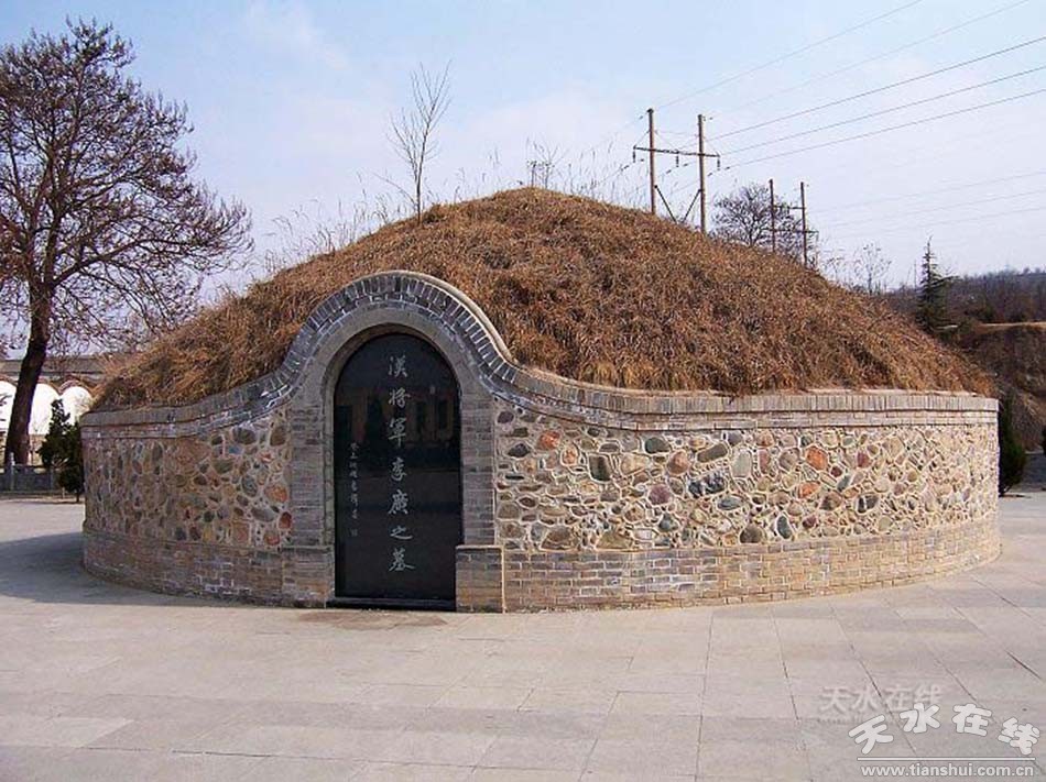 位于天水市秦州區(qū)石馬坪的漢將軍李廣墓是李將軍的衣冠冢,現(xiàn)為甘肅省愛國主義教育基地。此墓最早建于何時已無從考究,但從杜甫流寓秦州時所寫“風(fēng)連西極動,月過北庭寒。故老思飛將,何時議筑壇”詩句中可見,唐朝時天水的父老鄉(xiāng)親常常懷念李將軍功績,并議論要公祭李將軍,F(xiàn)在可考的是,前人于1739年仲秋重建“飛將佳城”,墓地有墓碑、墳冢、護(hù)冢馬、祭祀殿。1936年,當(dāng)?shù)卣畬顝V墓進(jìn)行了最大規(guī)模的維修和擴(kuò)建。將軍英姿重?zé)ㄉ裢鬂h之風(fēng)再顯雄壯。