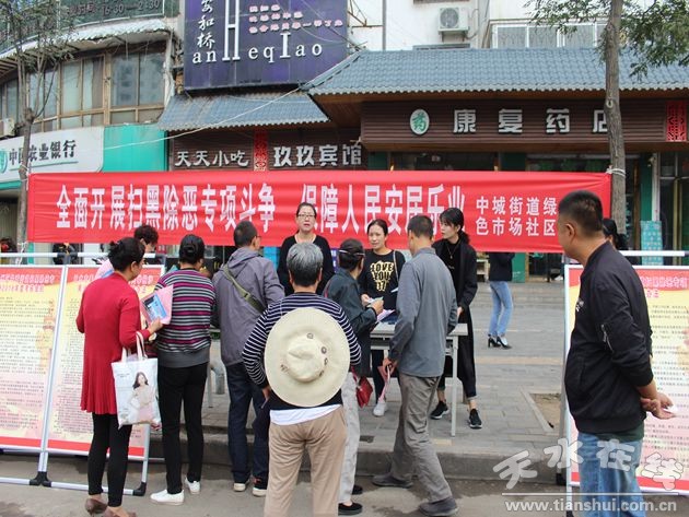 為深入貫徹落實(shí)黨的十九大精神,依法嚴(yán)厲打擊涉黑、涉惡違法犯罪活動(dòng),切實(shí)保障轄區(qū)居民的合法權(quán)益,提升廣從 大居民的安全感、幸福感,維護(hù)轄區(qū)和諧穩(wěn)定,9月12日上午,中城街道辦事處統(tǒng)一安排部署,在綠色市場(chǎng)西口開展“掃黑除惡”專項(xiàng)斗爭(zhēng)宣傳活動(dòng)。