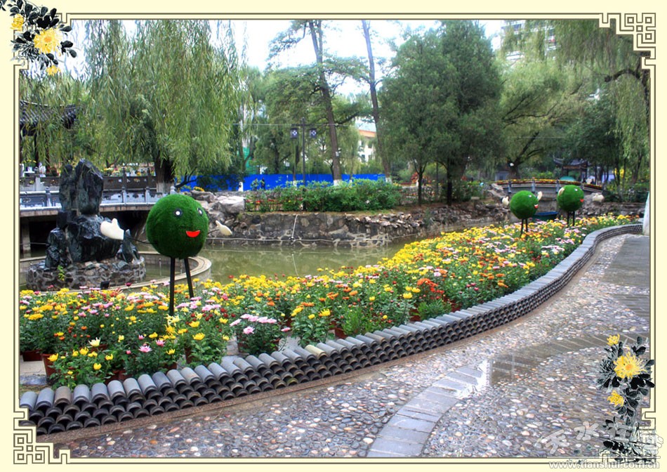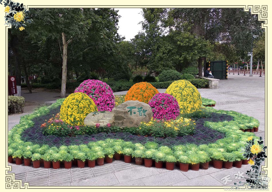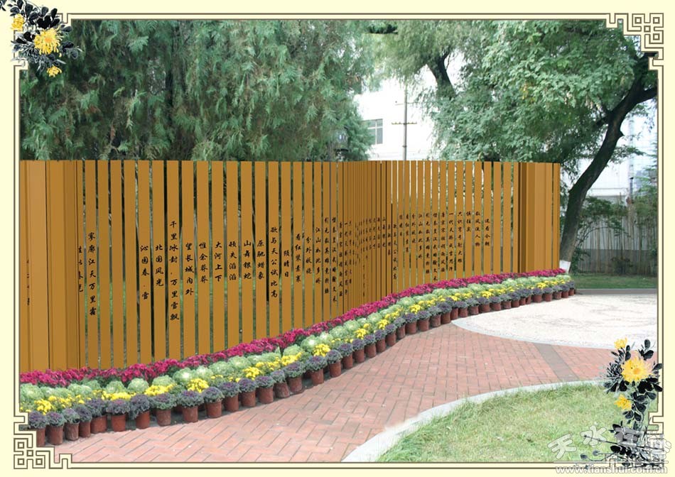 公園南側(cè)設(shè)為竹簡展區(qū),竹簡上鐫刻毛澤東詩詞《沁園春﹒長沙》、《沁園春﹒雪》和《采桑子﹒重陽》,以氣勢磅礴的詩詞彰顯滾滾的歷史長河中,先秦大地,秦墨漢簡的厚重古樸。竹簡前方通道設(shè)6面長4m×2.5m的圍墻組合,圍墻為古秦州白墻灰瓦青磚的建筑風(fēng)格,沿圍墻設(shè)置圓形和長方形中國風(fēng)幾架組合,前方設(shè)置白色幾架組合,利用明顯的色差來提高視覺沖擊,用鏤空的中國風(fēng)幾架與硬質(zhì)墻體相組合,立體幾架構(gòu)筑與軟質(zhì)菊花相結(jié)合,相得益彰,渾然天成。