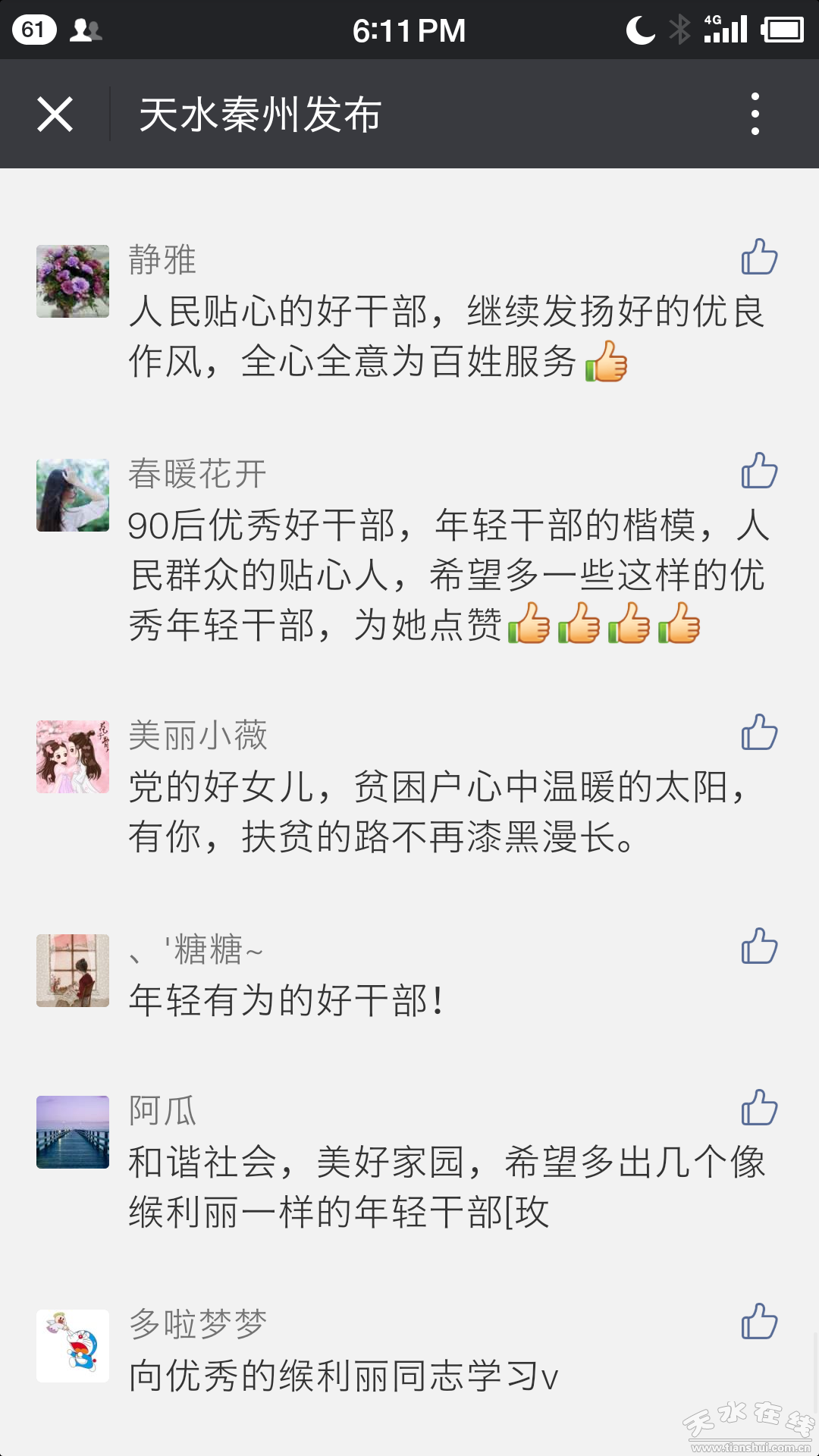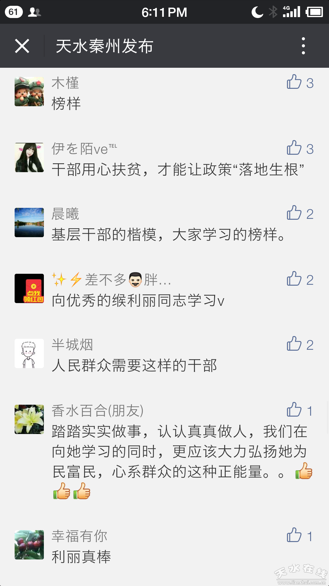 新聞報道《天水90后干部:貧困戶里盤點對賬 吃透政策點穴幫扶》在天水秦州發(fā)布微信公眾號上轉發(fā)后反響強烈,從跟帖中我們看到的是:戰(zhàn)斗在脫貧攻堅一線的“戰(zhàn)友們”對緱利麗的敬意,娘娘壩鎮(zhèn)村民們對這位“村官”的肯定,緱利麗家鄉(xiāng)太京鎮(zhèn)的父老鄉(xiāng)親表達出的自豪之情……廣大網(wǎng)友的點贊充滿正能量,為緱利麗這樣俯下身子樸實務實的90后干部感動、叫好,說“這么年輕的干部能腳踏實地,實實在在為群眾辦實事、辦好事,能夠想群眾之所想,急群眾之所急,是我們的榜樣。”“人民群眾需要這樣的干部!”“苔花如米小,也學牡丹開,在平凡的崗位上做出不平凡的成績,讓群眾認可,向她學習”……