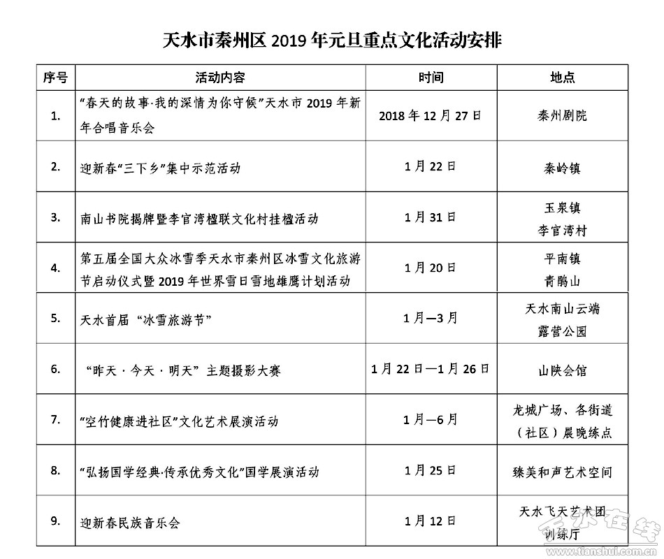 秦州區(qū)外宣辦1月18日訊(劉可)記者從18日召開的秦州區(qū)2019年新春文化活動安排會上獲悉,今年新春期間,秦州區(qū)共組織開展各類文化活動40項。除“春天的故事·我的深情為你守候”合唱音樂會等已開展的活動外,其余活動將在1至3月間密集開展。這些活動中,既有社火匯演、玉泉觀上九廟會、元宵節(jié)燈展等保留“節(jié)目”,也有迎新春干部職工文藝演出等一些新的“節(jié)目”。