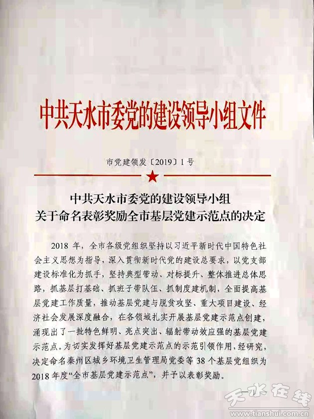 秦州區(qū)城鄉(xiāng)環(huán)衛(wèi)局黨委一直以來深入學(xué)習(xí)貫徹習(xí)近平新時代中國特色社會主義思想和黨的十九大精神,充分發(fā)揮黨組織的政治核心和監(jiān)督保障作用,樹牢“四個意識”,堅定“四個自信”,堅決做到“兩個維護”,充分發(fā)揮全體黨員的先鋒模范作用,帶領(lǐng)9個基層黨支部以黨建凝聚人心、促進服務(wù),以黨建促進發(fā)展、提升質(zhì)量,全力建設(shè)基層學(xué)習(xí)型、服務(wù)型、創(chuàng)新型黨組織。2019年2月27日,在召開的天水市組織部長會議上,秦州區(qū)城鄉(xiāng)環(huán)衛(wèi)局黨委被天水市委組織部授予“全市基層黨建示范點”榮譽稱號。