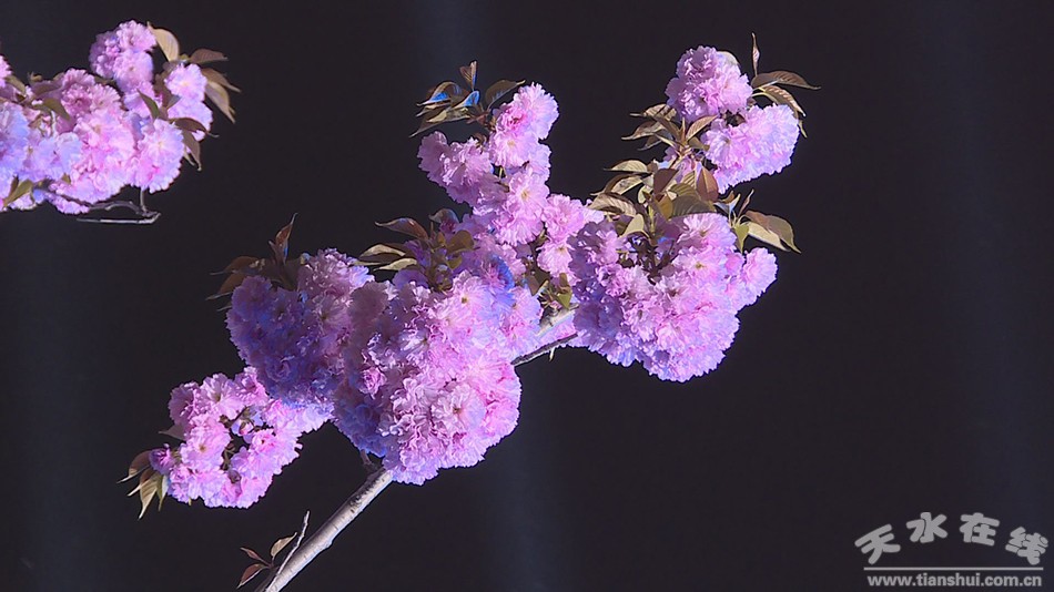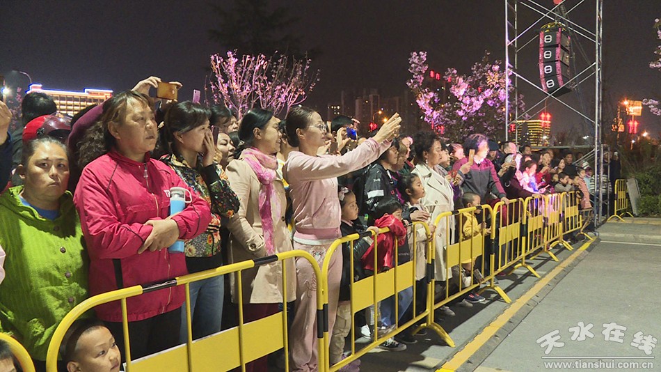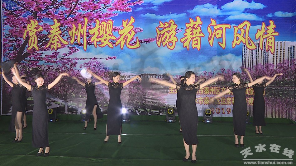夜晚的秦州,櫻花璀璨,香氣迷人。晚上八點半,文藝表演在盛開的櫻花樹下拉開帷幕。歌曲《有一個叫龍城的地方》、《田野的春天》,舞蹈《九兒》、《芳華》等一個個精彩節(jié)目輪番上演。
