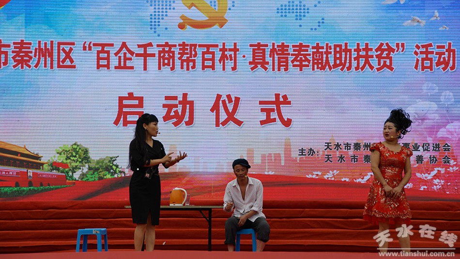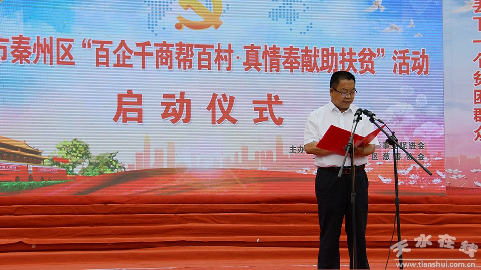 活動(dòng)儀式上,秦州區(qū)委常委、統(tǒng)戰(zhàn)部部長(zhǎng)劉睿智宣讀了《天水市秦州區(qū)“百企千商幫百村·真情奉獻(xiàn)助扶貧”活動(dòng)倡議書》,號(hào)召全區(qū)廣大企業(yè)家、非公經(jīng)濟(jì)代表人士、個(gè)體工商戶、及社會(huì)各界朋友弘揚(yáng)“致富思源、富而思進(jìn)、義利兼顧、以義為先、扶危濟(jì)困、共同富!钡墓獠示瘢瑘(jiān)持“社會(huì)參與、主動(dòng)自愿、量力而行、真情奉獻(xiàn)”的原則,積極投身“百企千商幫百村·真情奉獻(xiàn)助扶貧”活動(dòng),伸出援助之手,貢獻(xiàn)一份力量,慷慨解囊,紓困解難,提供資金幫扶,用行動(dòng)助推脫貧,展示企業(yè)良好形象,彰顯社會(huì)責(zé)任擔(dān)當(dāng)。