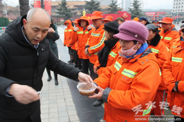 1月2日上午,秦州區(qū)總工會聯(lián)合愛心企業(yè)全席美食城開展了“香飄臘八粥、溫暖環(huán)衛(wèi)工”慰問環(huán)衛(wèi)工人活動,為那些在寒冷中仍然堅持在一線的環(huán)衛(wèi)工人帶去了一分暖意和關懷。