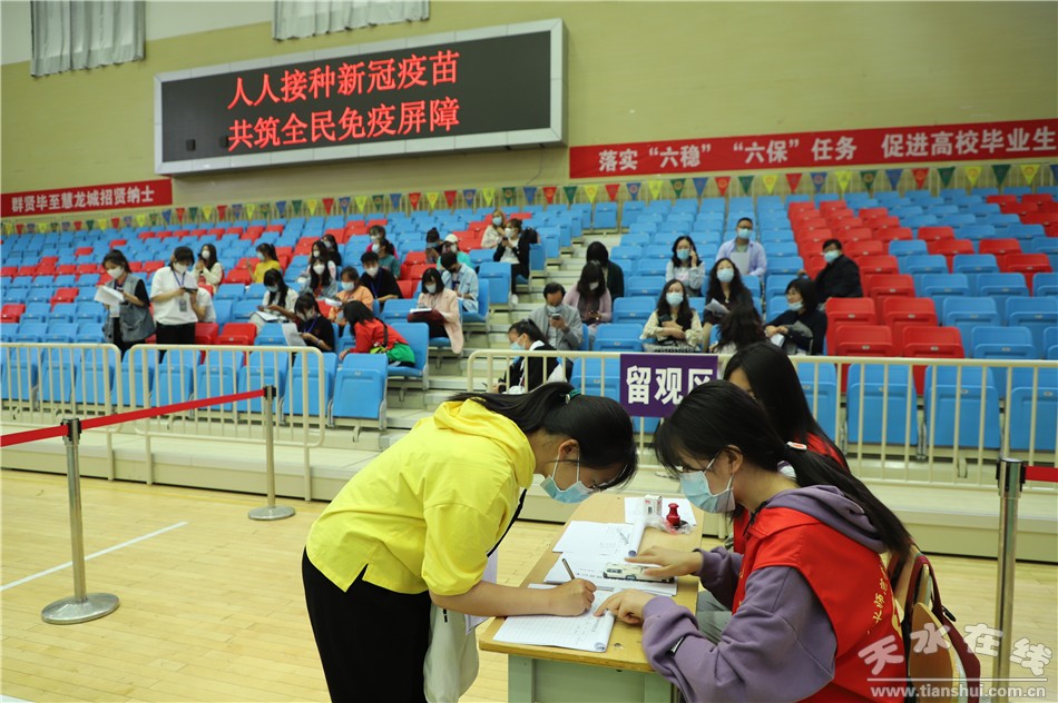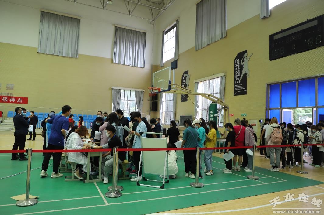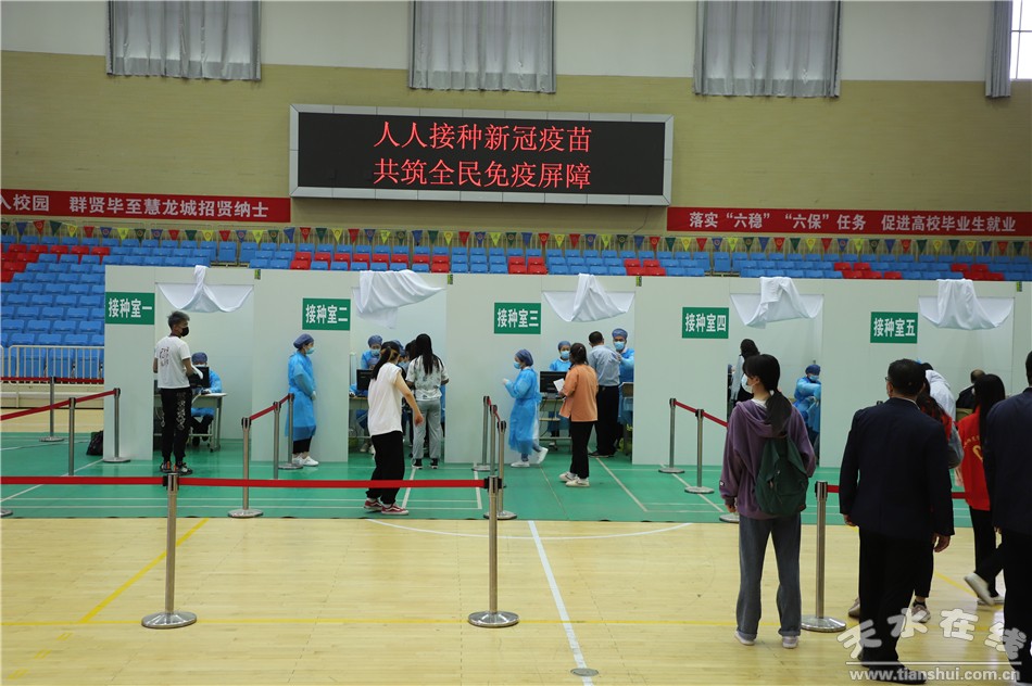 在天水師范學院,體育館設(shè)置成了新冠疫苗接種點,分設(shè)了登記區(qū)、候種區(qū)、接種區(qū)、觀察區(qū)、救治區(qū)五個區(qū)域。秦州區(qū)王家磨社區(qū)衛(wèi)生服務(wù)中心的醫(yī)護人員和志愿者共35人負責學校約2萬師生的新冠病毒疫苗接種工作。天水四O七醫(yī)院的8名急診科專家和護士負責異常反應(yīng)的處置救治工作,同時設(shè)置了兩輛備用救護車。學校20名學生參與志愿服務(wù)活動,維護接種秩序。