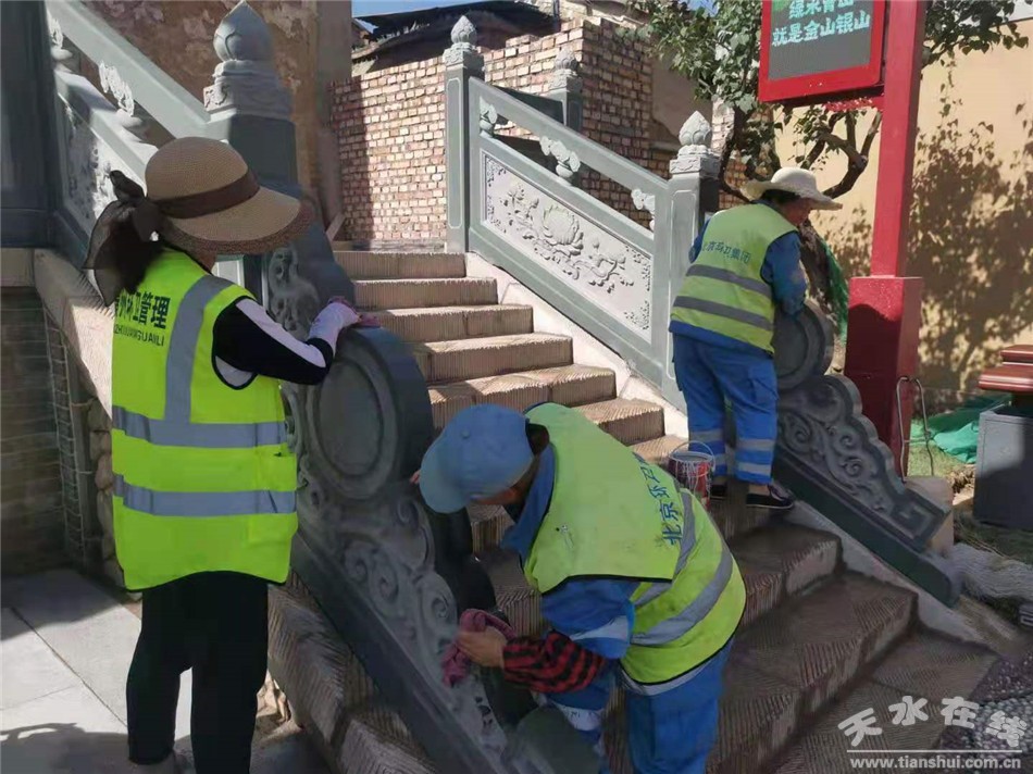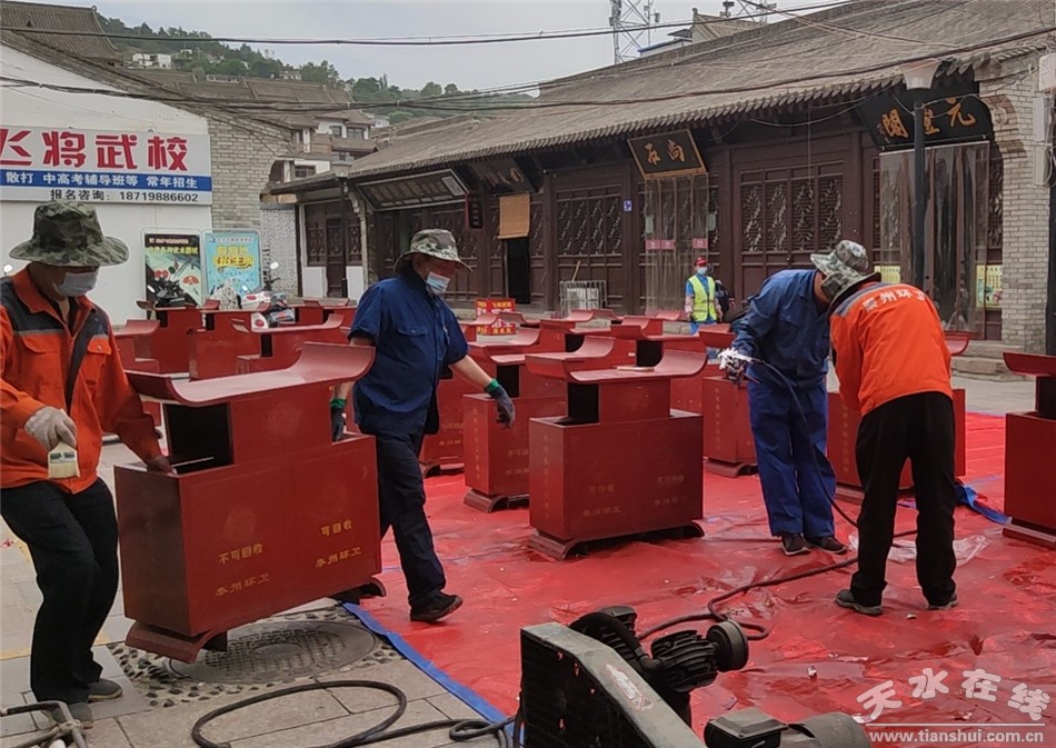 加強(qiáng)基礎(chǔ)設(shè)施維護(hù),靚化城市容顏提升城市品質(zhì)。結(jié)合創(chuàng)建文明城市進(jìn)一步提升城市形象,集中力量更換維修油飾城市環(huán)衛(wèi)基礎(chǔ)設(shè)施,截至目前伏羲城內(nèi)65個(gè)果皮箱、29個(gè)垃圾桶以及城區(qū)其他區(qū)域2000個(gè)果皮箱、600個(gè)垃圾桶、500個(gè)手推車油飾維修更換已全部完成。針對(duì)伏羲城步行街沿街門(mén)店的部門(mén)門(mén)窗、步行街走廊、仿古建筑、墻面出現(xiàn)的不同程度掉漆、破損現(xiàn)象,組織專業(yè)人員進(jìn)行重新油飾粉刷修補(bǔ),油飾粉刷4500平方米。同時(shí)對(duì)伏羲城內(nèi)建筑物、道路全部進(jìn)行清理沖洗,確保伏羲城步行街“顏值”提升,通過(guò)完善城市環(huán)衛(wèi)基礎(chǔ)設(shè)施,不斷靚化城市環(huán)境,讓秦州古城更添魅力。