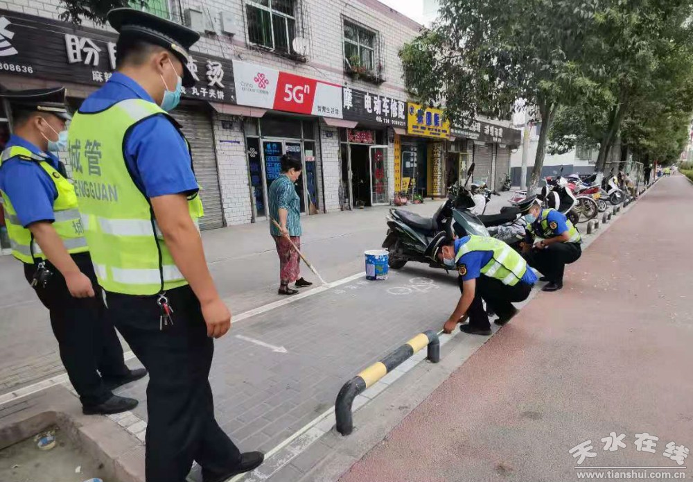 為提升市容環(huán)境秩序,破解非機(jī)動(dòng)車停放難題,秦州區(qū)執(zhí)法局在此次專項(xiàng)整治中,以“應(yīng)劃盡劃”為原則,結(jié)合實(shí)際情況,對中心城區(qū)內(nèi)人行道較為寬敞的區(qū)域施劃停車位,并按照規(guī)定標(biāo)準(zhǔn)設(shè)置配套交通標(biāo)志標(biāo)線,施劃停車位導(dǎo)向箭頭,提高道路空間利用率和道路通行能力。