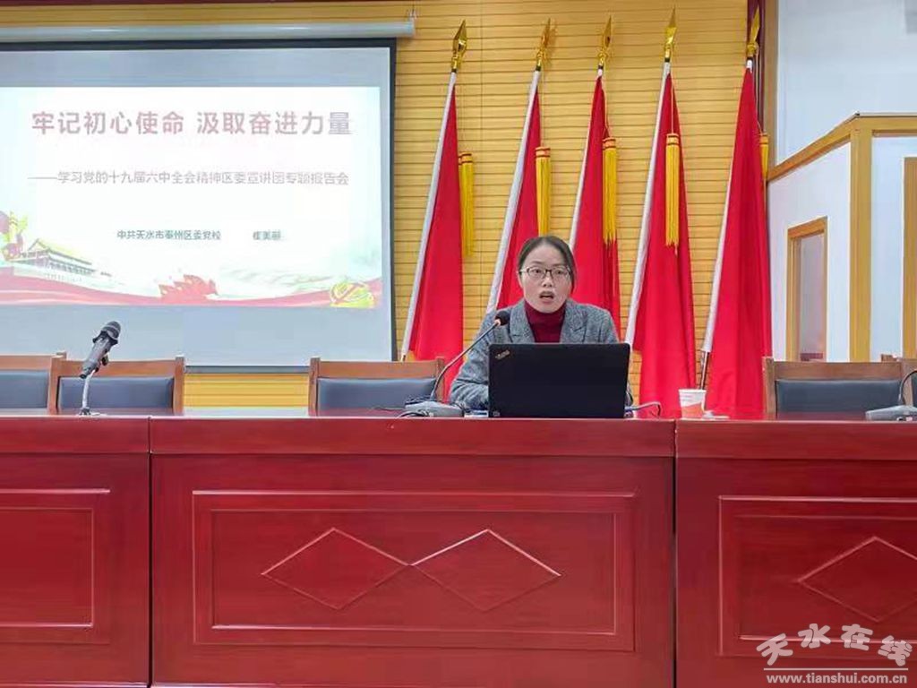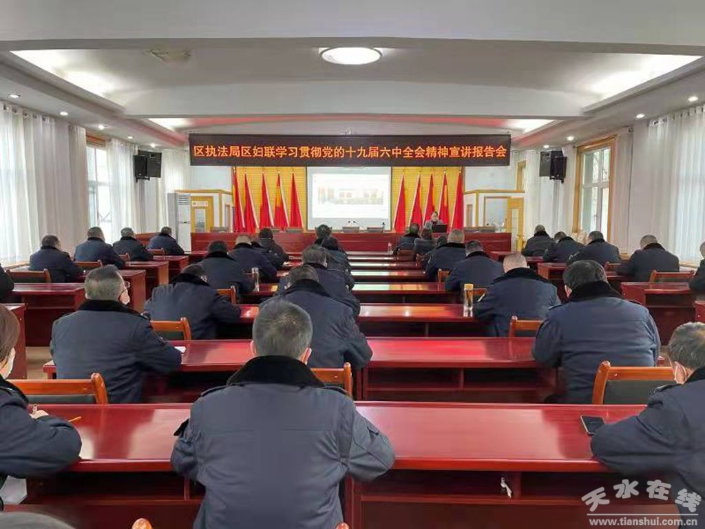 12月24日上午,秦州區(qū)執(zhí)法局舉行黨的十九屆六中全會精神宣講報告會,邀請區(qū)委黨校講師崔美麗同志作專題宣講報告。重點就我們黨百年奮斗重大成就和歷史經驗,持續(xù)深化黨史學習教育,以偉大的建黨精神指引“十四五”開好局、起好步做解讀。區(qū)婦聯(lián)全體和執(zhí)法局黨員干部80余人一起聆聽報告。