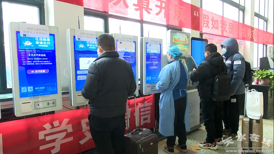 天水汽車總站調(diào)度班長汪娟:“自春運開始,我們總站平均每天的人流量有600人左右,今年因疫情影響,較往年客流量相對減少,遇高峰期時,我們會加設窗口,隨時有加班班次和加班車輛,隨時引導乘客線上購票、自助機購票,這樣大大降低了人流量的擁堵和疫情的傳播!