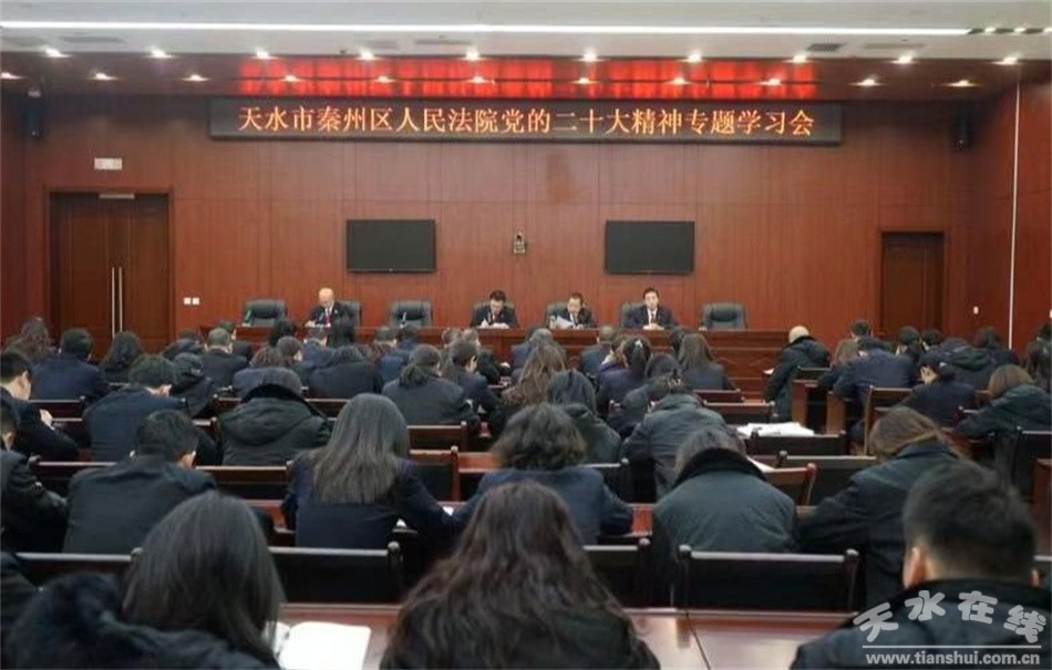 秦州區(qū)人民法院組織全院干警專題學(xué)習(xí)黨的二十大精神。會(huì)議強(qiáng)調(diào),全院要深入學(xué)習(xí)貫徹黨的二十大精神,切實(shí)履行好維護(hù)國家安全、社會(huì)安定、人民安寧的重大責(zé)任,堅(jiān)持服務(wù)大局、司法為民、公正司法,為建設(shè)幸福美好新秦州提供有力司法服務(wù)和保障。要牢牢堅(jiān)持黨對(duì)人民法院工作的絕對(duì)領(lǐng)導(dǎo),切實(shí)增強(qiáng)政治判斷力、政治領(lǐng)悟力、政治執(zhí)行力,堅(jiān)持多形式、全覆蓋學(xué)習(xí)宣傳貫徹黨的二十大精神。要深刻領(lǐng)悟“兩個(gè)確立”的決定性意義,增強(qiáng)“四個(gè)意識(shí)”、堅(jiān)定“四個(gè)自信”、做到“兩個(gè)維護(hù)”,切實(shí)將黨中央和省市區(qū)委決策部署貫徹落實(shí)到法院各項(xiàng)工作中。要全面加強(qiáng)審判執(zhí)行工作,充分發(fā)揮法治固根本、穩(wěn)預(yù)期、利長遠(yuǎn)的保障作用,積極助力法治秦州建設(shè)。堅(jiān)定不移貫徹總體國家安全觀,依法懲治犯罪、保護(hù)人民、定紛止?fàn)、化解矛盾,常態(tài)化開展掃黑除惡,有力維護(hù)國家安全和社會(huì)穩(wěn)定。要正確貫徹實(shí)施憲法法律,促進(jìn)行政爭議實(shí)質(zhì)性化解,服務(wù)法治秦州建設(shè)。堅(jiān)持以人民為中心,維護(hù)最廣大人民根本利益,讓人民群眾的獲得感、幸福感、安全感更加充實(shí)、更有保障、更可持續(xù)。要持之以恒推進(jìn)全面從嚴(yán)管黨治警,嚴(yán)格落實(shí)新時(shí)代政法干警“十個(gè)嚴(yán)禁”,持續(xù)狠抓防止干預(yù)司法“三個(gè)規(guī)定”落實(shí),不斷完善考核評(píng)價(jià)機(jī)制,充分激發(fā)全院干警干事創(chuàng)業(yè)的積極性,努力打造一支黨和人民信得過、靠得住、能放心的法院鐵軍。