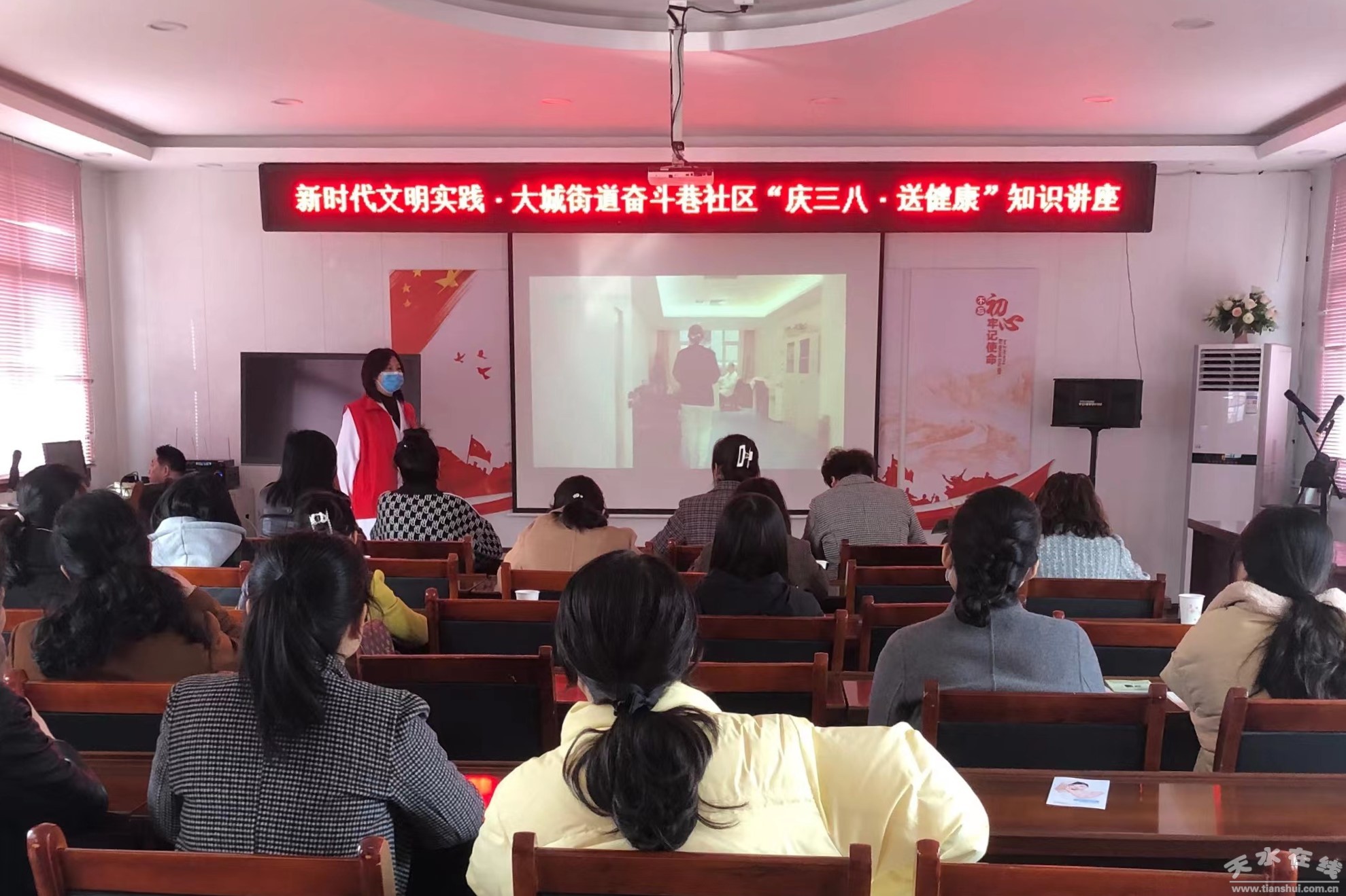 大城街道奮斗巷社區(qū)新時代文明實踐站開展“慶三八,送健康”知識講座,由天水市四0七皮膚美容中心主任醫(yī)師為大家講解“女性常見及春季高發(fā)皮膚病解決方案”的專業(yè)知識,并對婦女代表提出的各類皮膚問題作了詳盡專業(yè)的解答,婦女代表們互相交流,現(xiàn)場氣氛熱烈。