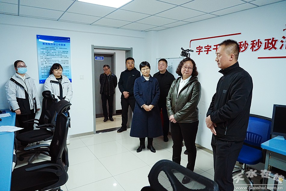 張宇晶一行實地查看了秦州區(qū)融媒體中心新聞演播室、新聞采編室、制作中心、播出機(jī)房等陣地建設(shè)情況,詳細(xì)了解了功能設(shè)置、人員配備、新聞采編、安全播出等情況,并聽取了中心近期工作開展情況的匯報。